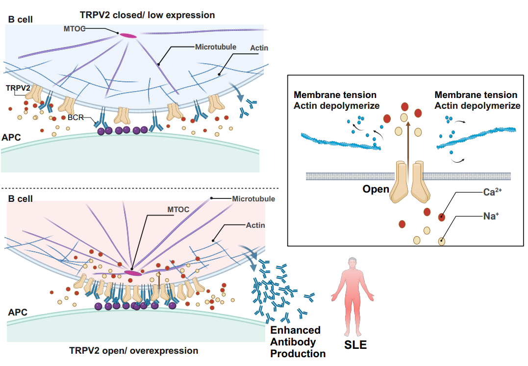 综上所述,该研究报道TRPV2在B细胞中的高水平表达与流感抗体的生成以及系统性红斑狼疮患者的病情显著相关,阐明TRPV2主要通过调节膜区离子流动和细胞骨架的重塑来影响B细胞的活化。缺乏TRPV2的B细胞在免疫突触形成过程中,细胞骨架重组和下游信号转导方面表现出显著缺陷。该研究不仅揭示了TRPV2在B细胞免疫反应中的重要性,还为未来提高疫苗效能、开发自身免疫病的新型治疗靶点和生物标志物奠定了坚实的科学基础。