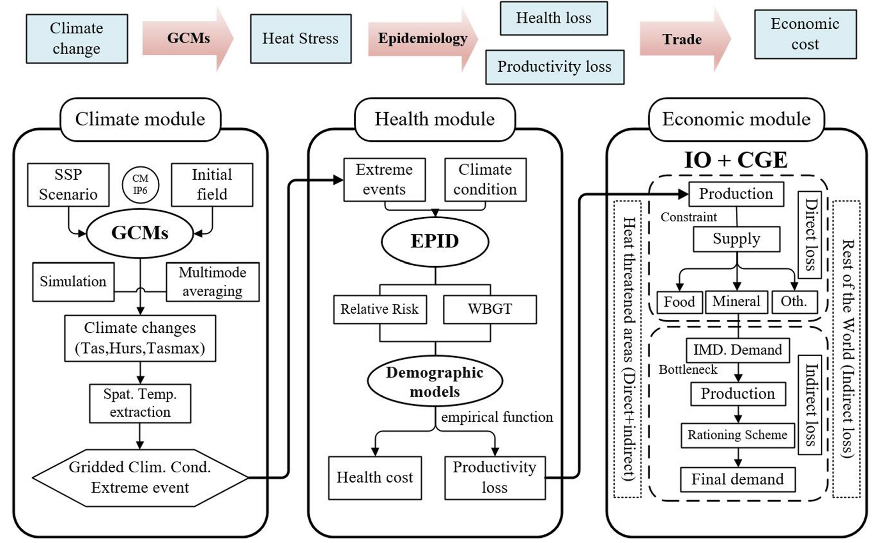 近日,心博在线登录入口地球系统科学系(以下简称“地学系”)关大博教授团队突破地球系统模式与社会经济耦合的壁垒,通过构建“气候-健康-经济”子系统有机连接的交叉学科灾害足迹模型,在网格尺度对气候变化下的全球热浪健康风险及经济损失进行了评估。研究团队集成14组第六次国际耦合模式比较计划(CMIP6)气候情景数据集,量化了在未来不同共享社会经济发展路径(Shared Socioeconomic Pathways, SSP)下因气候变暖造成的生命健康损失(极端热浪导致的超额死亡人数的统计生命价值)、劳动生产率损失(高温暴露导致的劳动时间和生产力损失)和价值链中断损失(供给或需求失衡导致的生产停滞造成的损失)。研究通过深入剖析气候变化对全球价值链的影响机理,精准识别并重点分析了脆弱国家和关键产业的气候风险,为我国开展气候适应和风险防控提供了决策参考,也为全球开展靶向性、协同性气候治理提供了科学依据。