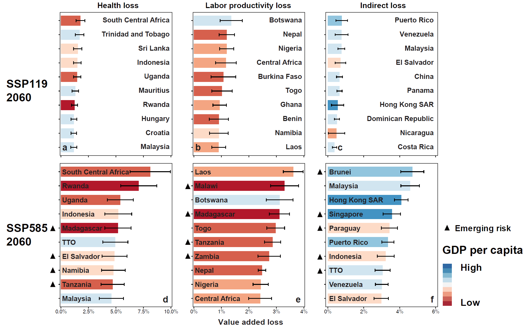 图2.气候变化情景下全球不同区域的“非平行”风险暴露。a-c,SSP119情景下健康损失(a),劳动生产率损失(b)和间接损失(c)最严重的10个经济体。d-f为SSP585情景
