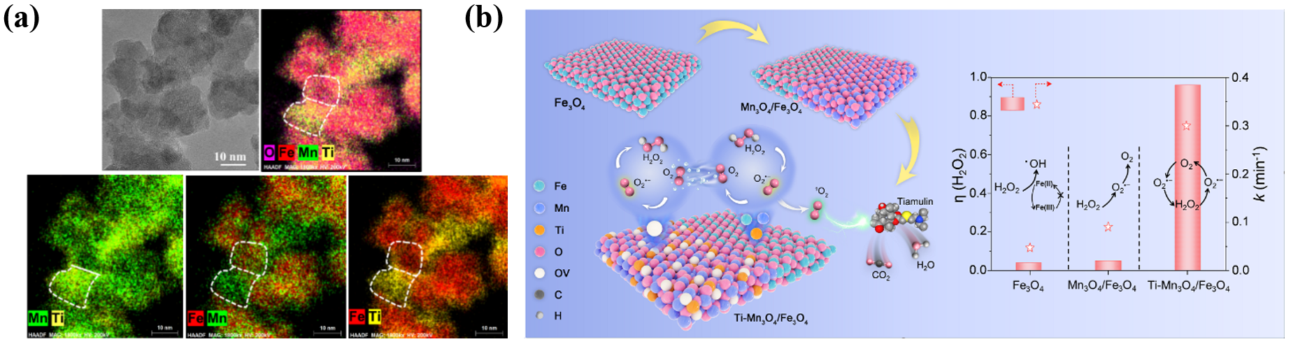 团队研究通过Ti掺杂合成富含离域性质氧空位的Ti-Mn3O4/Fe3O4三元纳米材料,以增强H2O2的利用效率。研究表明,Ti掺杂使Ti-Mn3O4/Fe3O4具有弱Fe−O键和Mn−O键,及具有离域性质的氧空位,增强对O2的吸附和活化。氧空位介导的O2/O2•−/H2O2氧化还原过程可活化局部生成的O2,促进O2•−生成动力学,从而有效促进H2O2原位生成,弥补体系中被消耗的H2O2,实现H2O2的高效利用。