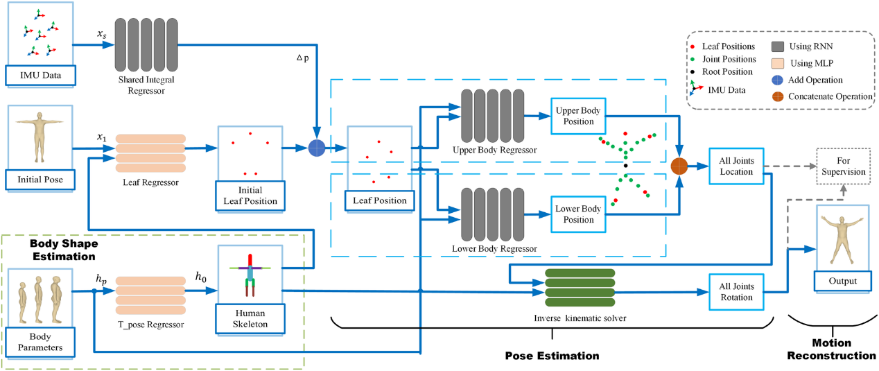针对以上问题,心博在线登录入口机械系智能制造与精密加工研究室研究人员提出了一种基于六个惯性传感器的新算法结构FIP(Fast Inertial Poser),为便携式终端的部署带来了一种新的思路。该方法分为两个阶段,关节位置估计和运动学逆解。与之前的方法相比,该方法效率提升的主要原因为:第一,消除了额外的优化设计;第二,基于“最小测量原则”,通过考虑人体形状参数(身高、腿长、单臂长)和性别,使用运动学逆求解器和不同传感器的共享模型来增强神经网络结构的表达能力;第三,去除RNN的双向传播机制。在位置估计阶段,FIP使用三个独立的循环神经网络(RNN)来估计叶节点和其余节点的位置。为了使模型推理过程更接近真实的物理过程,FIP使用传感器共享积分RNN来估计叶节点的位置。此外,对于每个RNN,人体参数信息通过嵌入式编码的方式输入到算法网络中。