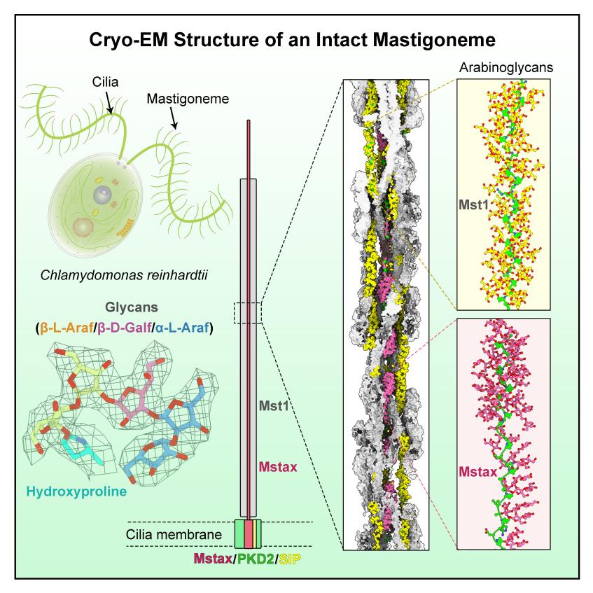 Mstax包括近8000个氨基酸残基,具有34个Mstax特异性的多聚Hyp重复序列片段。该重复序列富含大量复杂糖基化修饰,并且每个重复序列片段可以招募4个Mst1分子。Mstax重复序列区域从纤毛膜区域延伸到纤绒毛的远端,成为整个Mastigoneme组装的骨架。此外,Mstax还具有阳离子通道PKD2样跨膜结构域,可与PKD2在纤毛膜上形成1:3的离子通道,从而解释了纤绒毛潜在的机械力感知模式。该研究为理解天然生物架构(Bio-architectures)中蛋白质和糖类分子形成复合物的相互作用模式提供了理论基础。