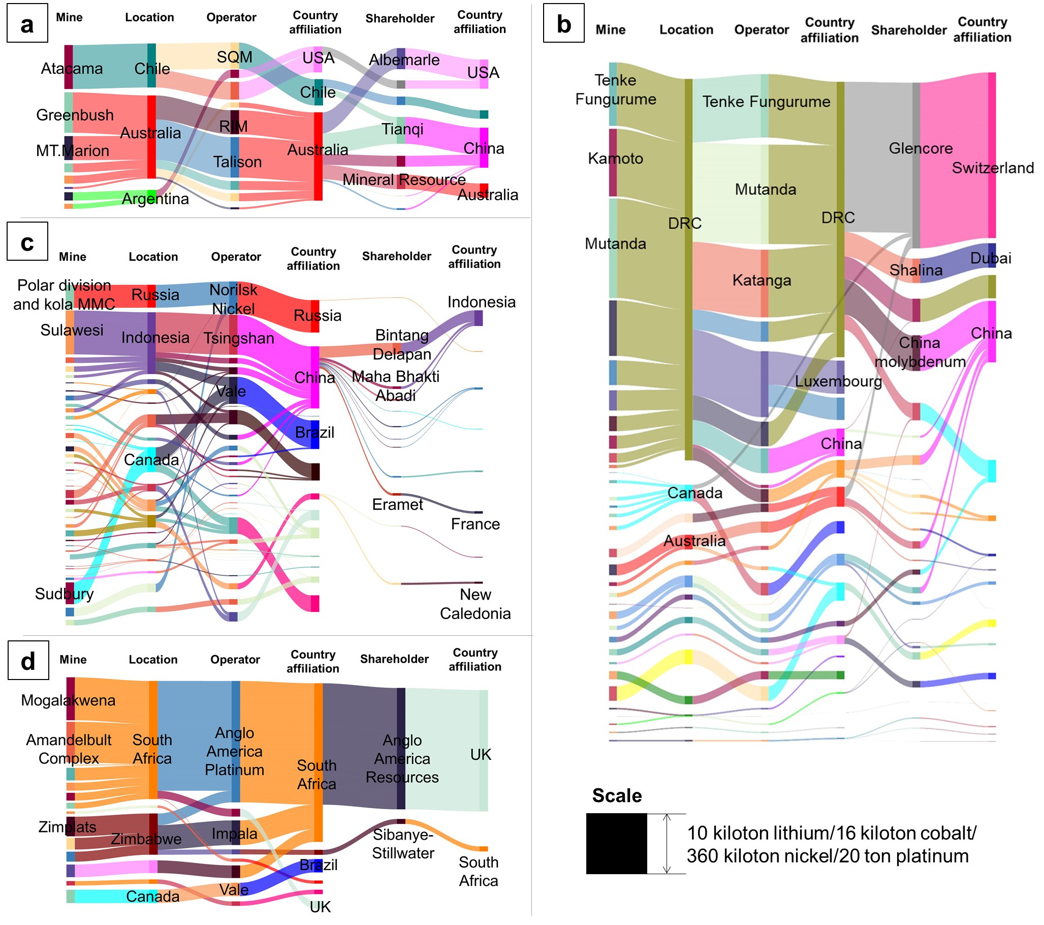 研究团队发现,在2019年全球有47%的锂、71%的钴、41%的镍和34%的铂的生产受外国直接投资控制。由于广泛的外国直接投资存在,四种材料的全球生产和贸易网络的地理和公司视角之间存在明显的所有权差异。在所有外国直接投资中投资者都遵循“母国优先”模式的假设情景下,外国直接投资在缓解美国的锂供应、英国的铂供应、日本的镍供应、中国的锂和钴供应的风险方面具有巨大潜力。在只有国家主导的投资者才会优先考虑本国利益的情景下,外国直接投资对供应风险的缓解作用主要体现在由中国国有企业主导的钴和镍行业。两种视角下的SRI量化结果的比较差异体现了外国直接投资在降低供应风险方面的潜在作用,而现实情况则介于研究团队所建立的两种情景结果之间。研究结果揭示了在关键材料供应安全评估中考虑外国直接投资的重要性。