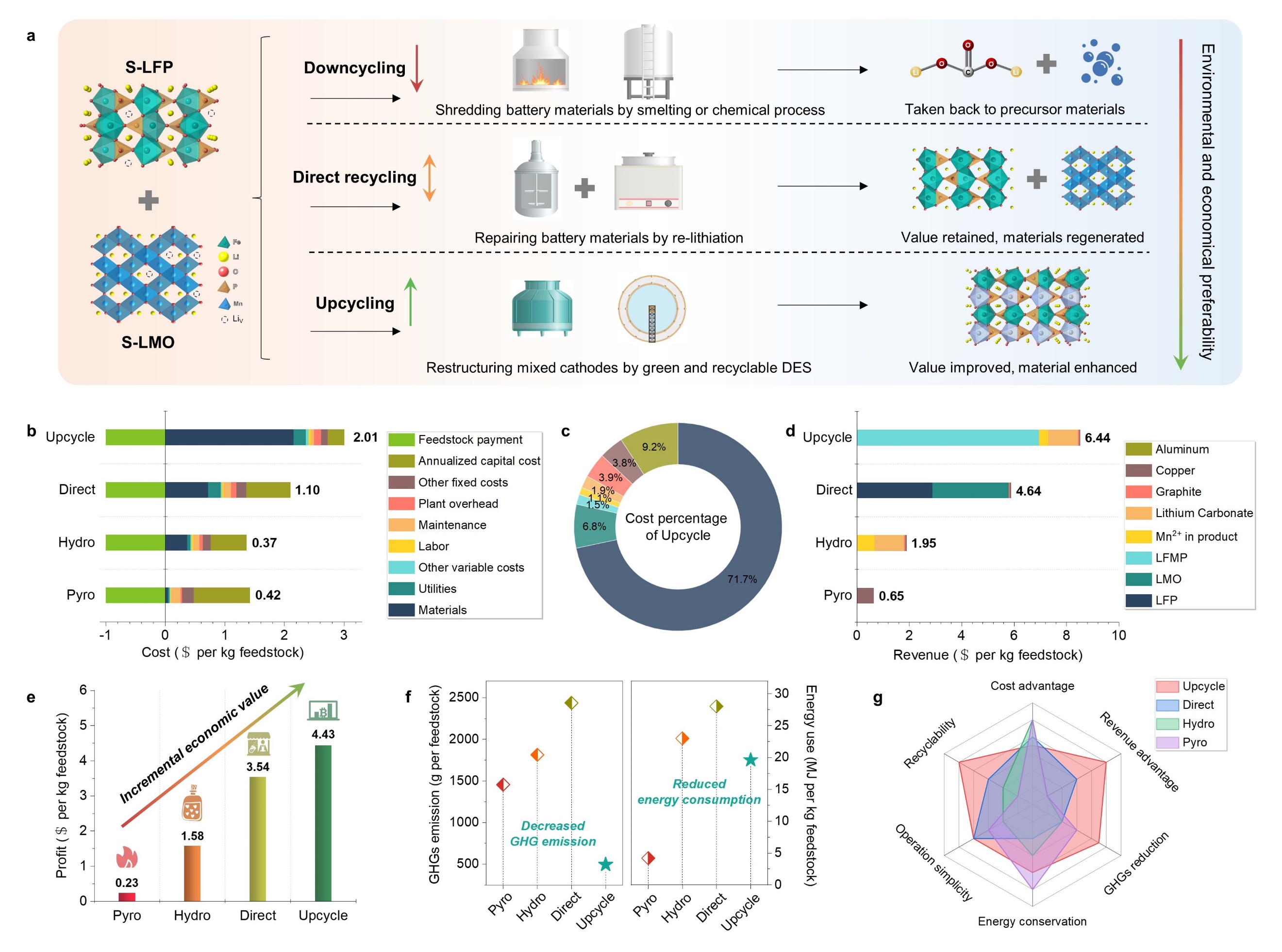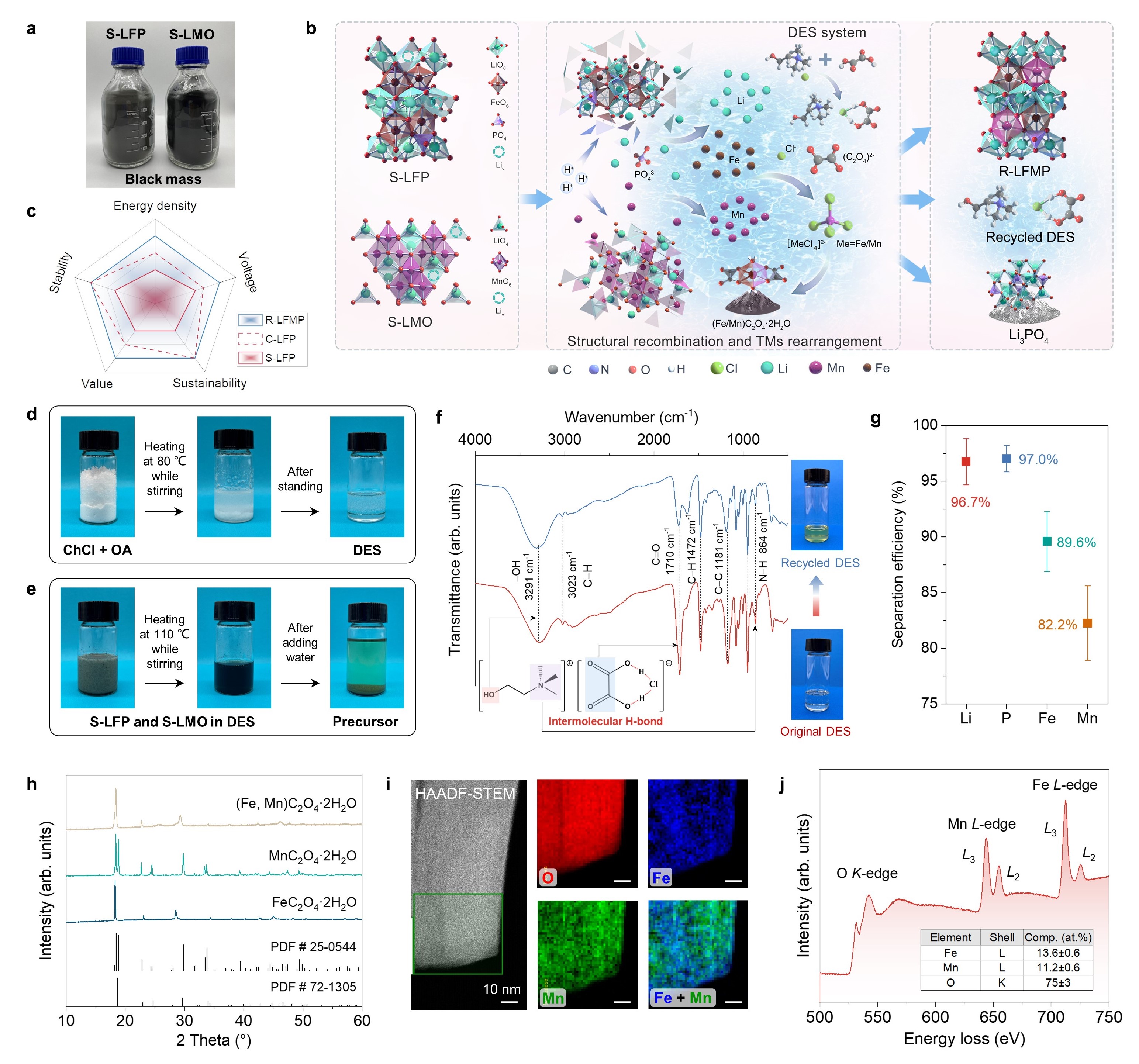 首页网5月23日电 近年来,锂离子电池(LIB)的可持续回收逐渐成为业内关注焦点。在电池的所有组分中,正极材料占据最大重量并主导了电池成本,其回收再利用刻不容缓。商业正极材料包括橄榄石型磷酸铁锂(LFP)、层状钴酸锂/三元材料以及尖晶石锰酸锂(LMO)。因为这些正极具有不同的晶体结构,目前的直接回收方法主要针对单一特定成分,同时处理多种正极材料仍面临很大挑战。传统火法或湿法回收通过高温熔炼或化学过程破坏电池材料,并需要复杂的步骤来分离不同的元素,导致二次污染。更重要的是,失效LFP或LMO电池中的有价元素含量低,而这些方法产生的Fe/Mn产物具有较低经济价值,因此需要发展更好的回收技术来实现混合正极材料的经济回收。