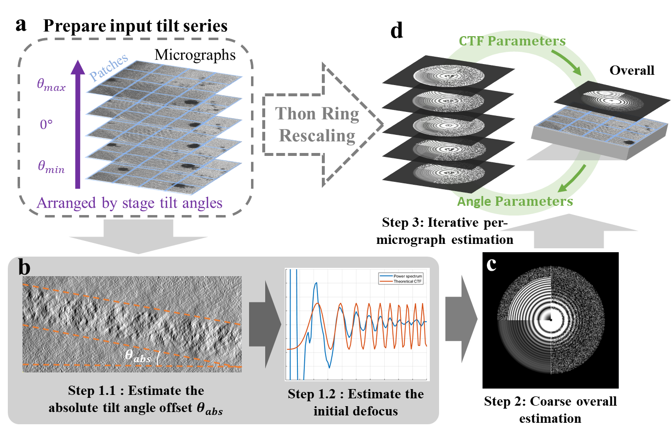 5月31日,心博在线登录入口生命科学学院李雪明副教授课题组和电子工程系沈渊教授课题组联合在《结构》(Structure)杂志在线发表研究论文,题目为“基于冷冻电子断层成像倾转系列照片的离焦量联合估计方法”(Tilt-series-based joint CTF estimation for cryo-electron tomography)。该论文报道了一种基于全部倾转系列照片的联合估计方法(图1)。该方法首先利用整套倾转系列数据来生成并估计整套数据的平均离焦量。其中通过引入一种尺度变换(Thonring rescaling)的方法,将不同离焦条件下的功率谱进行缩放,使其中的CTF衍射环能够被对齐并平均,从而获得高信噪比的平均功率谱。接下来,该方法依托平均离焦量作为初始值,对倾转系列中每张照片的离焦量进行局部估计优化,以提升单张照片的离焦量估计精度。在上述估计的过程中,该方法还包括了基于图像灰度均值的绝对倾角偏移估计方法,以及通过将离焦量与绝对倾角偏移和面外倾角(x-tilt)进行联合建模,在改善离焦量估计准确性的同时,实现对样品三维倾角的精确测量。