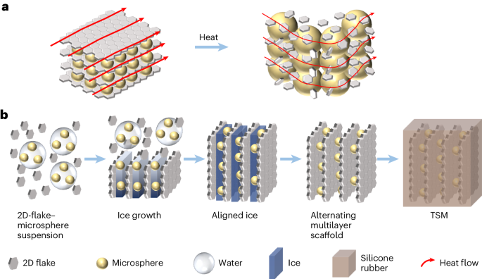 研究团队提出通过在二维导热骨架单体片层间嵌入特定温度范围的热触发膨胀微球作为热开关,利用膨胀微球的微观应力应变,将导热骨架推散。电池热失控产生的瞬时热冲击功率进一步原位陶瓷化隔层,形成类气凝胶结构。
