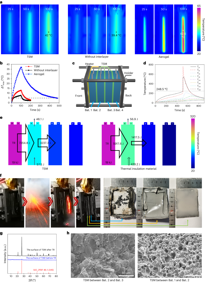 图2.热切换材料在电池模组中的实际应用(a)散热测试中电芯隔层为热切换材料、气凝胶和没有隔层的电池模组的红外图像。(b)三种情况下电池模组ΔTmax变化曲线。(c)用于热蔓延测试的电池模组组装示意图。(d)电芯隔层为热切换材料时单体电芯的温度随时间变化曲线。(e)隔层材料为热切换材料或气凝胶的电池模组在热蔓延测试期间的热通量仿真计算值。(f)热切换材料在热失控测试过程中充当热智能保护层,其形貌随着距热源的远近而变化。(g)热切换材料经热冲击前后的XRD图谱。(h)热失控测试后的热切换材料的SEM图像