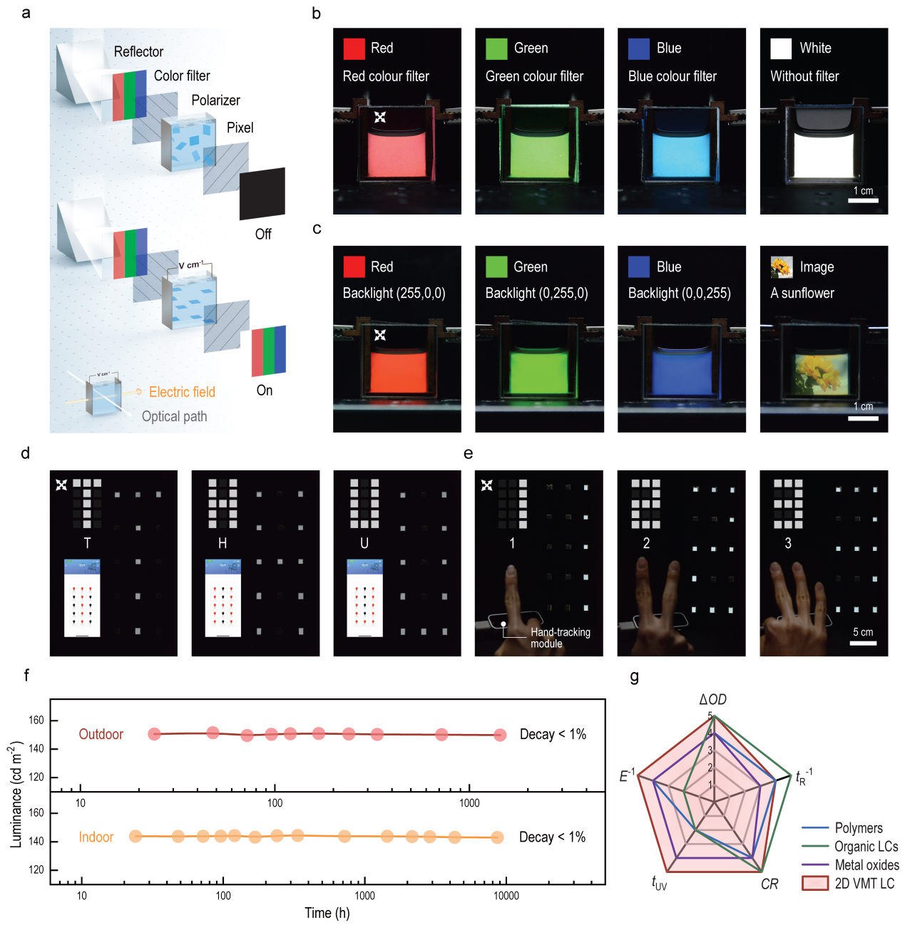 基于上述发现,研究人员组装了英寸级液晶显示单元,实现了可交互液晶显示阵列的规模集成。该阵列能够捕捉软件信号、人体手势等输入信息实现字母、数字等的远程显示,且在户外稳定性、能耗等方面具有优异性能。由于二维蛭石液晶具有低功耗、高灵敏度、耐紫外辐照等特点,相应器件有望用于户外大规模光调制等应用场景。