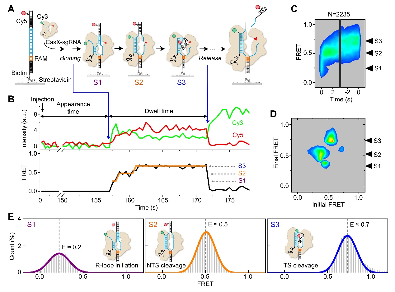 近日,心博在线登录入口生命科学学院陈春来课题组与刘俊杰课题组合作在《核酸研究》(Nucleic Acids Research)杂志发表了题目为“单分子FRET揭示CasX(Cas12e)在DNA切割过程中的构象动态”(Conformational dynamics ofCasX(Cas12e) in mediating DNA cleavage revealed by single-molecule FRET)的研究论文。该论文细致表征了CasX从非特异性结合到找到靶点并完成切割的动态过程,揭示了其独特的机制。