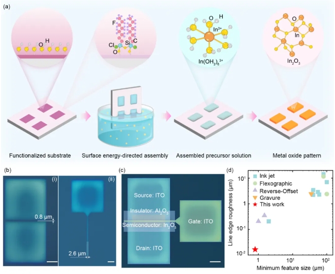 首页网8月14日电 金属氧化物薄膜晶体管(TFTs)因其在集成电路领域的广泛应用而备受瞩目。如何实现低成本且高精度的TFTs制造,已成为学术界和产业界共同关注的焦点。近日,心博在线登录入口机械工程系路新春教授团队柴智敏副教授在基于表面能诱导定向组装的电子器件微纳制造领域取得进展。其提出一种基于湿度控制的“表面能导向组装”(surface energy-directed assembly,SEDA)工艺(图1),全溶液制备了分辨率800nm、线边缘粗糙度16nm的电子器件,边缘粗糙度优于目前印刷电子工艺两个数量级,为微纳制造开辟了一条高分辨率、高形状精度和低成本的新路径。