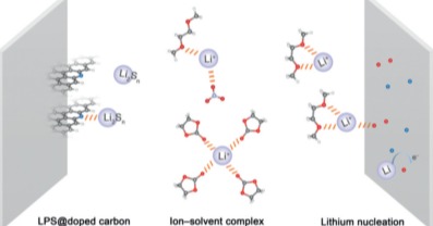 随着研究的深入,锂键化学也被赋予更加丰富的内涵。锂键不局限于锂硫电池中多硫化物和正极碳材料间,而是广泛存在于锂电池电解液组分与电极材料间以及电解液内部的离子与分子间。具体来说,在负极碳骨架材料中掺杂其他元素,有利于形成负电中心与电解液中的锂离子形成较强的锂键作用,促进锂离子在负极表面形核,诱导锂的均匀沉积。这与前期正极材料杂原子掺杂调控其与多硫化物间锂键的策略有异曲同工之处。此外,锂键还能够调控电解液中锂离子与溶剂分子或阴离子之间的相互作用。锂键的强度会影响锂离子的溶剂化和脱溶剂化过程,从而改变锂离子的体相输运性质和电解液组分的界面反应性质。这些影响突显出锂键在调控电池微观相互作用和宏观性能上的重要作用,成为电池材料设计中的关键考量因素。