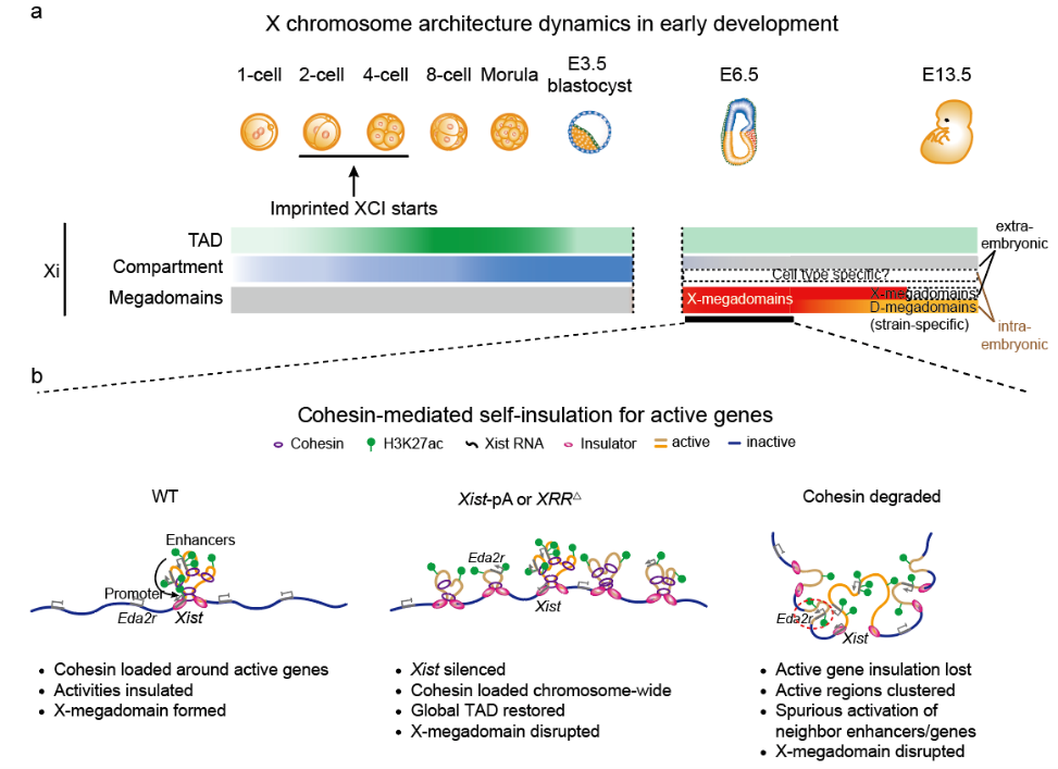 首页网9月20日电 在哺乳动物中,雌性(XX)与雄性(XY)细胞具有性染色体二态性。为了平衡基因表达水平,在胚胎发育早期,雌性细胞内一条X染色体会发生转录失活(X chromosome inactivation, XCI)。X染色体失活异常,会引起严重的胚胎发育缺陷,多种人类智力缺陷疾病,甚至胚胎死亡。因此研究X染色体失活及其调控机制具有重要的科学意义和临床价值。X染色体失活伴随着剧烈的X染色质结构变化,最终呈现为凝缩的异染色质状态,被称为“巴氏小体”。之前对体外小鼠胚胎干细胞(mESC)分化过程的研究发现,失活X染色体的拓扑结构域(TAD)和区室(compartment)结构都明显减弱,同时出现了以宏卫星序列Dxz4为边界的超级结构域(Dxz4-separated megadomains,D-megadomains)。