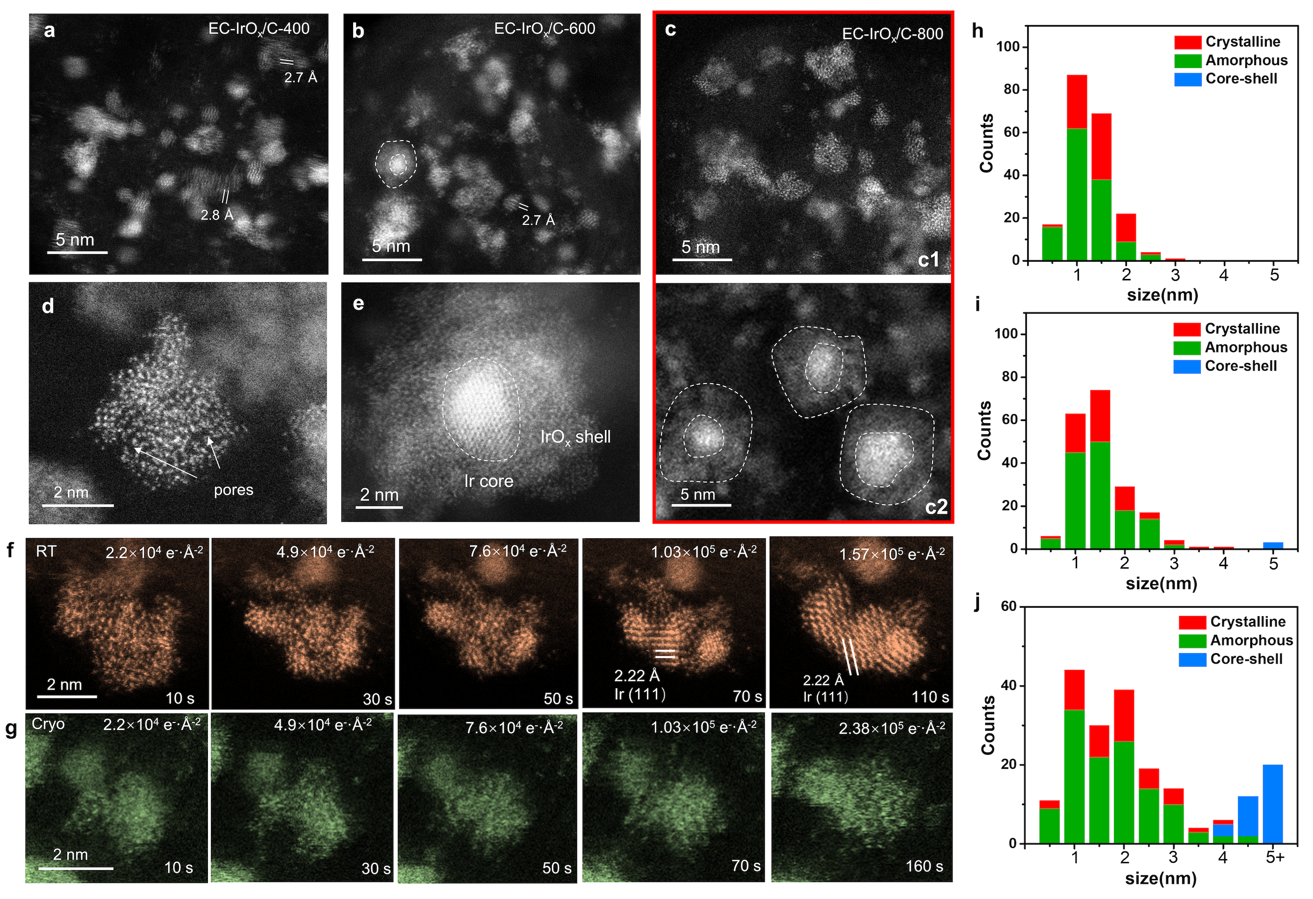 图3.电化学氧化后不同尺寸的IrOx纳米颗粒的常温和冷冻STEM表征与形貌统计