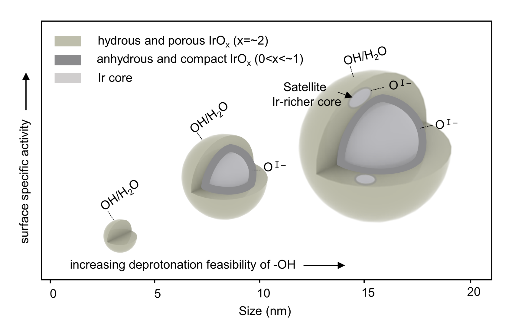 图6.电化学氧化制备的IrOx纳米颗粒的核壳精细结构及尺寸效应示意图