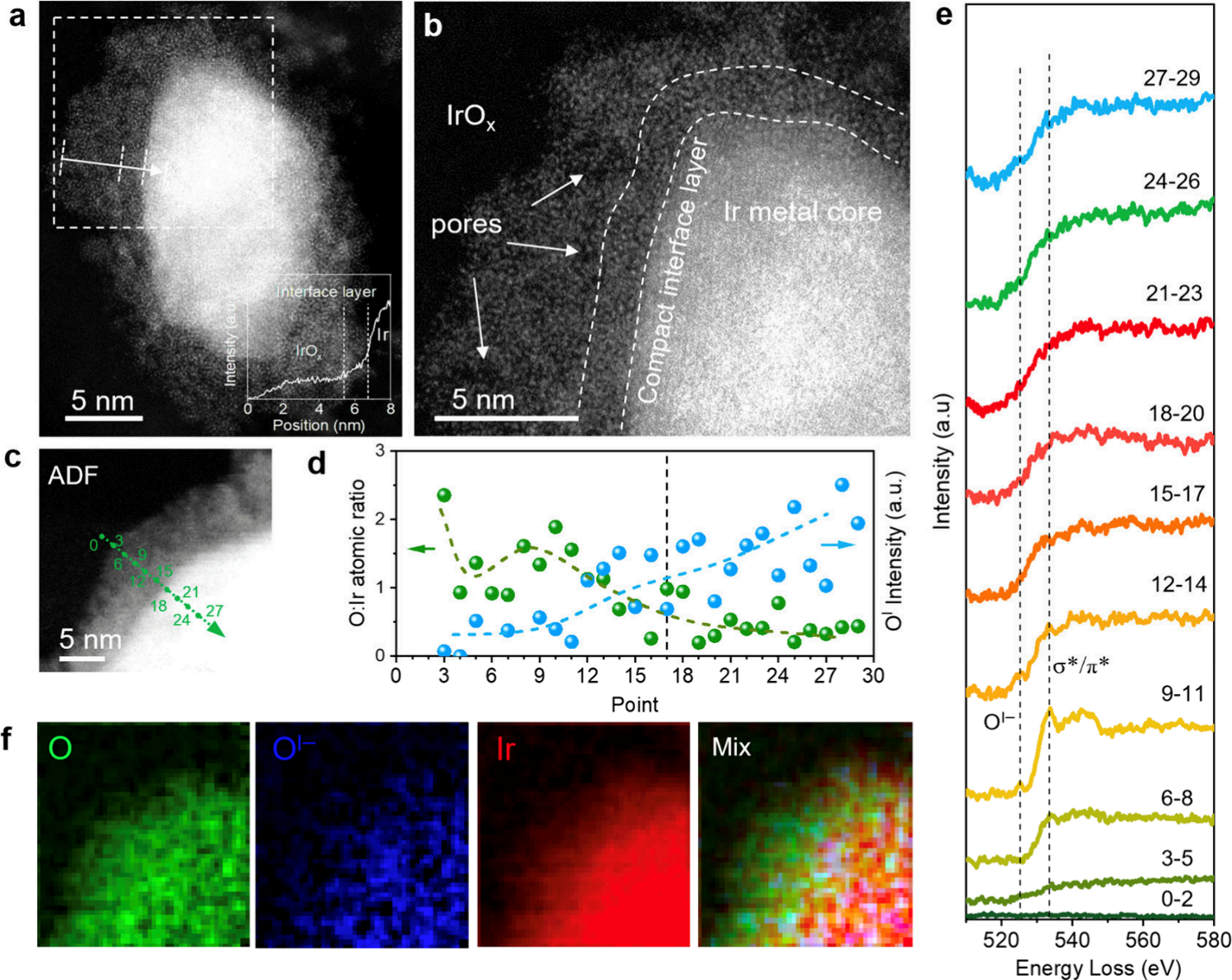 图4.晶态IrO2(a, b)、5 nm以下非晶IrOx纳米颗粒(c, d)、以及5–15 nm的IrOx核壳纳米颗粒(e, f)的STEM-EELS表征