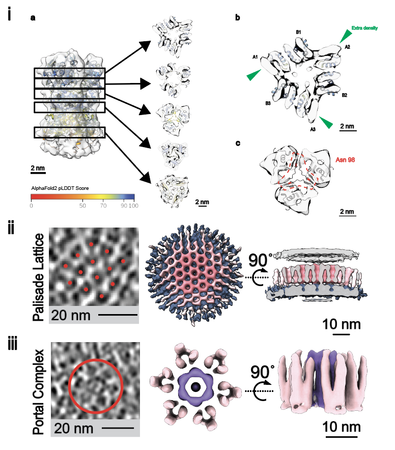 通过分析栅栏蛋白的组装规律,研究团队发现它们可灵活地排布成单元间距约为9nm的蜂巢状结构(图2,ii)。在内核上,团队也发现了花朵状的孔道复合体(图2,iii)。这些孔道复合体由六个栅栏蛋白围绕一个孔道复合体构成,并局部扰乱周边栅栏蛋白的蜂巢状排列模式。这些看似随机分布的花朵状孔道复合体可能与病毒早期转录阶段的物质进出有关。