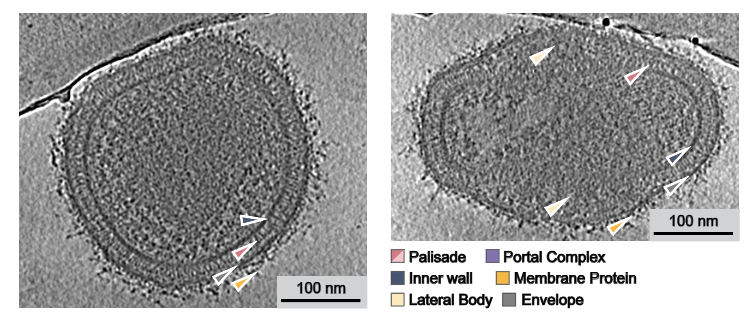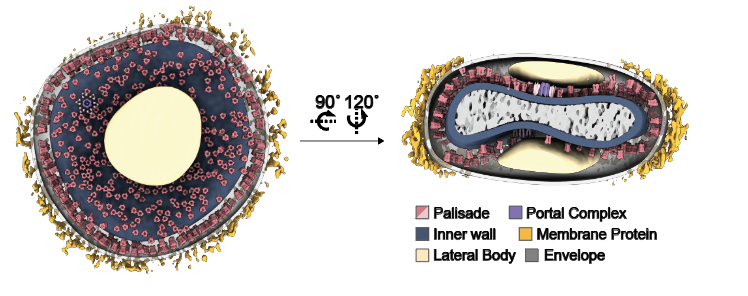 图1.猴痘病毒成熟病毒粒子的冷冻电子断层图像(正面及侧面)