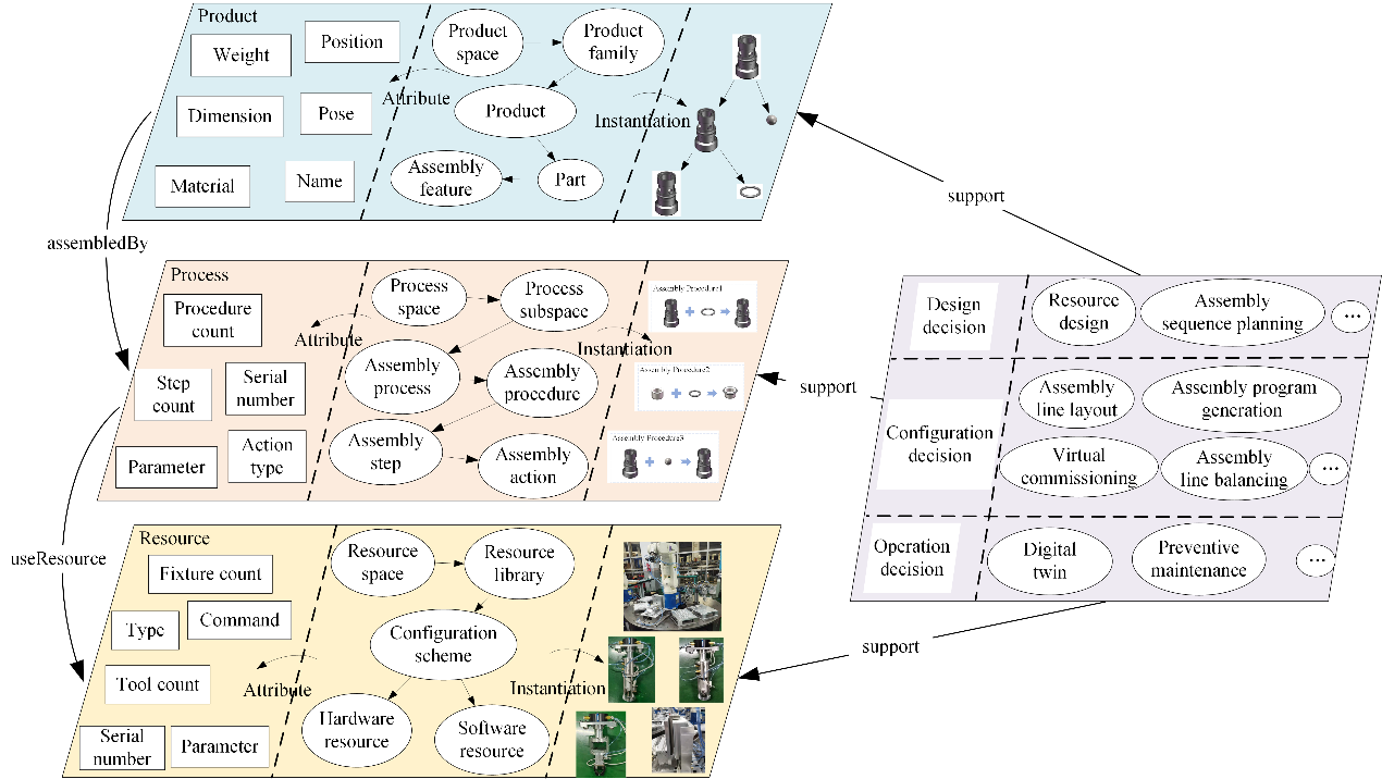 为了进一步实现面向跨品类可重构柔性装配产线的智能化,团队近期提出了一种新五要素装配理论模型(图2)和重构技术实现框架(图3)。五要素是指产品、工艺、资源、知识和决策,产品是指待组装的装配对象,工艺描述了产品是如何使用一个或多个装配资源逐步实现装配的,资源指执行工艺的机器、设备或装置,决策包括在整个装配过程中使用的各种装配方法。知识是对前四个要素的表示和存储,通常以结构化的形式表示,如知识图谱。该创新的形式化的五要素装配模型相比现有的装配模型,扩展了知识和决策两个要素,并将他们置于中心,以支持可重构柔性装配系统更柔性化、数控化、智能化。