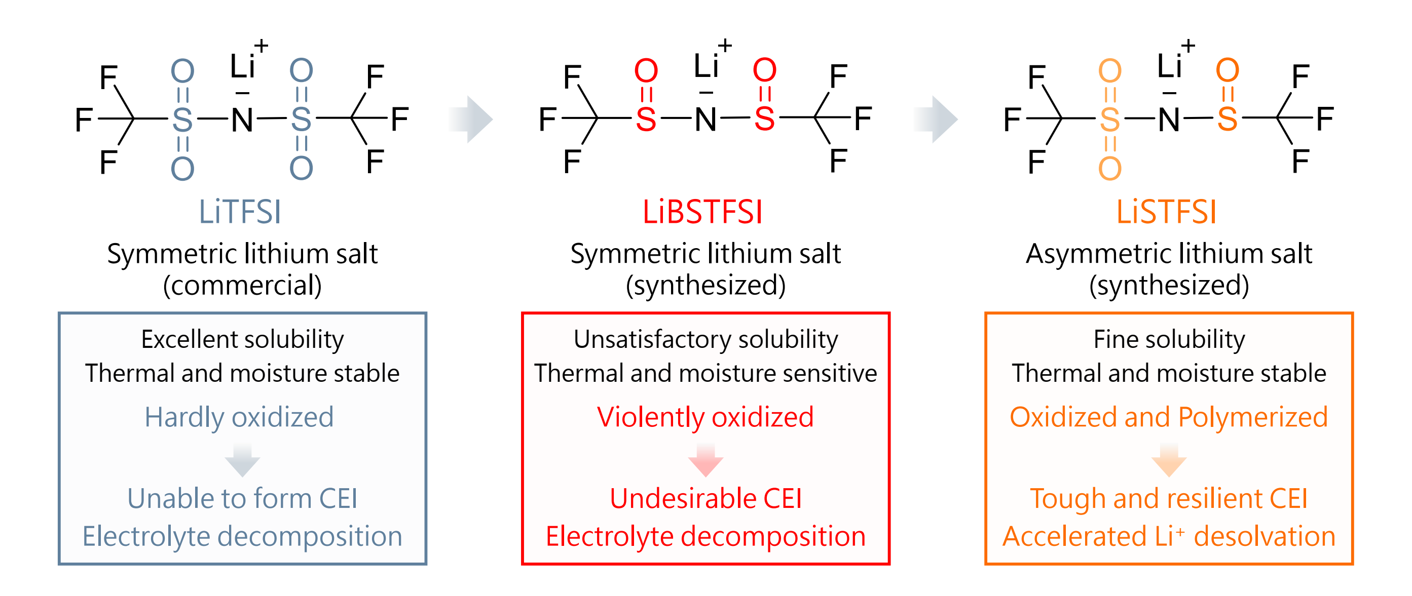刘凯课题组设计开发了一类全新的特殊不对称锂盐,致力于构建特殊的阴离子衍生CEI化学。基于传统的磺酰亚胺锂盐,设计合成的一类亚磺酰亚胺锂盐(LiSTFSI和LiBSTFSI),相较于传统的磺酰亚胺锂盐(例如LiTFSI)具有特殊的氧化性,能够在正极表面构筑阴离子衍生的界面化学。