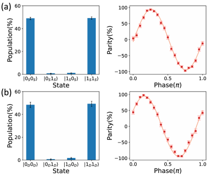 图2. 复合编码量子比特纠缠门结果(分别为ss纠缠,dd纠缠与sd纠缠保真度结果)