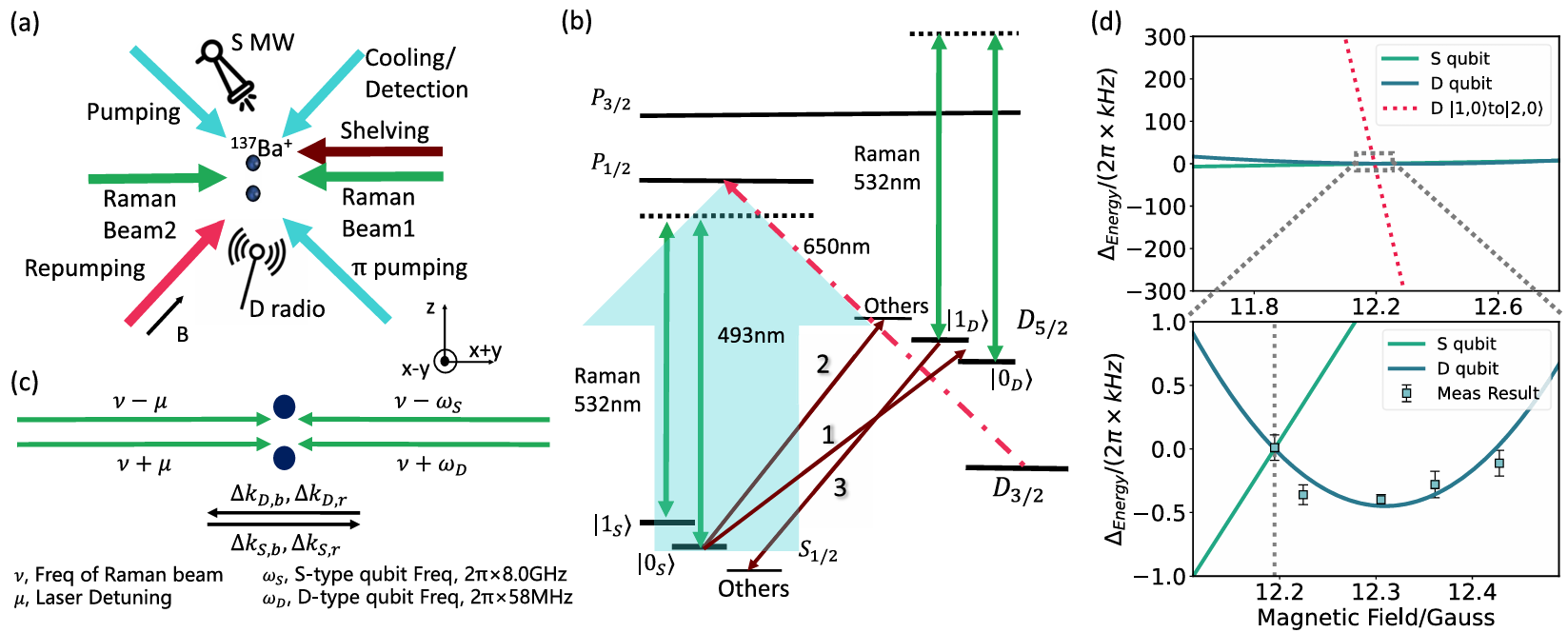 图1. 137Ba+离子的相关能级与打光方案,同时展现复合编码量子比特低磁场敏感性