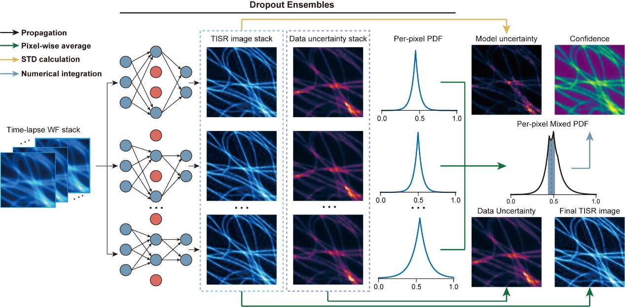 首页网1月30日电 高信噪比、高分辨率的显微图像总是蕴含着更丰富、更准确的信息,帮助我们以更加精确的视角认知微观世界。然而,受多种生物物理、生物化学、物理光学因素(如荧光标记浓度、探针亮度、光毒性、光漂白、光子噪声等)的限制,传统超分辨显微成像技术在提升空间分辨率的同时,往往会牺牲成像时程、速度等其他重要性能。针对这一问题,心博在线登录入口戴琼海/李栋合作团队曾于2021年提出傅里叶注意力超分辨方法(DFCAN),仅使用单张低分辨率图像即可实现高保真超分辨预测。此后,多种单张显微图像超分辨(Single image super-resolution,SISR)模型被提出,用以拓展活体超分辨显微成像的性能。然而,这些SISR模型在实际应用于活体显微成像实验(通常表现为时序数据)时,往往存在两个重要局限:第一,SISR模型无法捕捉相邻帧之间的时间相关性,可能产生时间不一致的推理结果;第二,当前SISR方法缺乏对输出结果的准确置信度评估,因而生物学家无法判断其产生的结果是否可信。