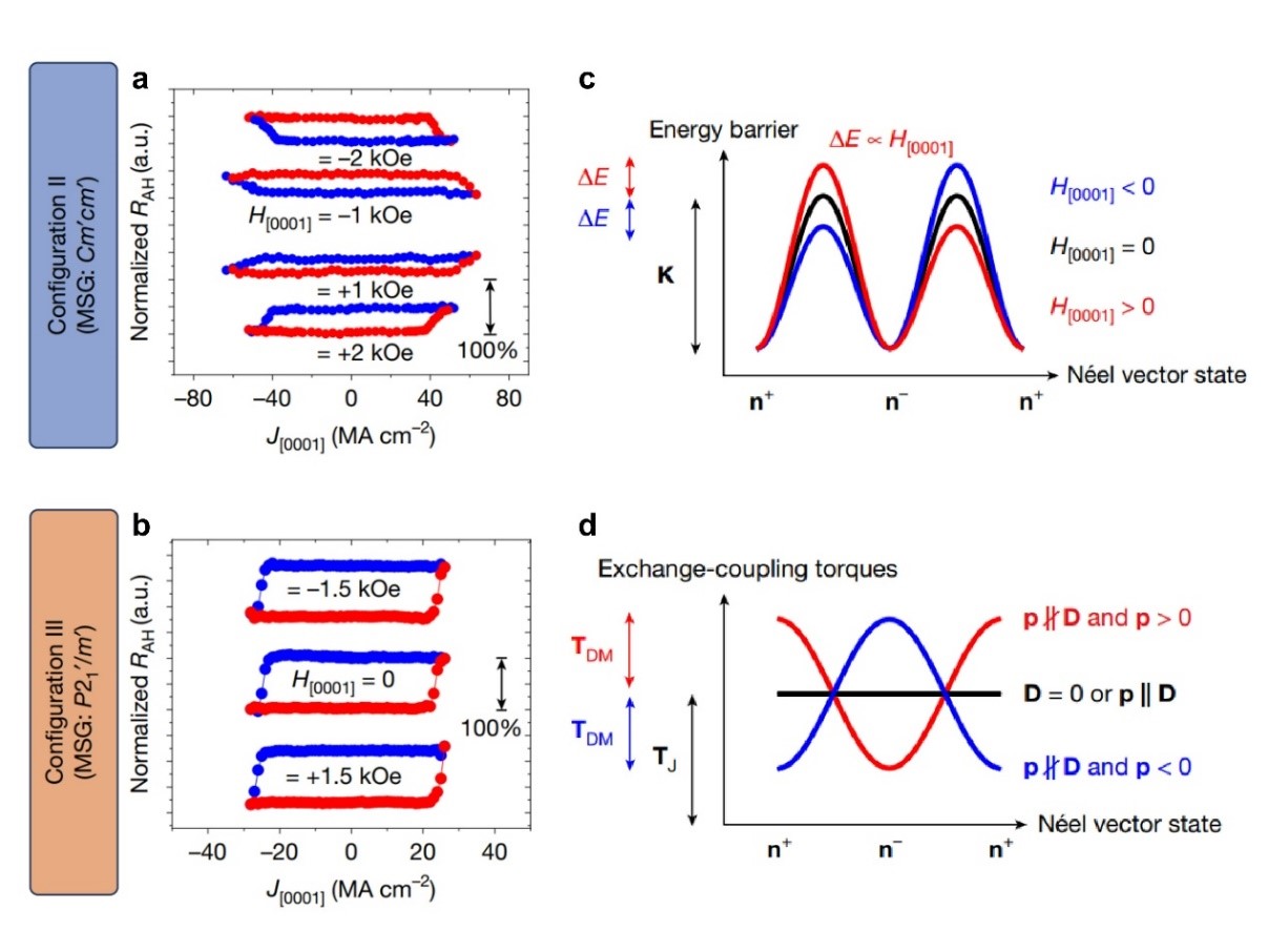 图3.CrSb/重金属异质结中两种不同的电学翻转模式。(a)磁场辅助的电学翻转;(b)零磁场电学翻转;(c)磁场诱导非对称性的势垒;(d)电流产生非对称性的驱动力