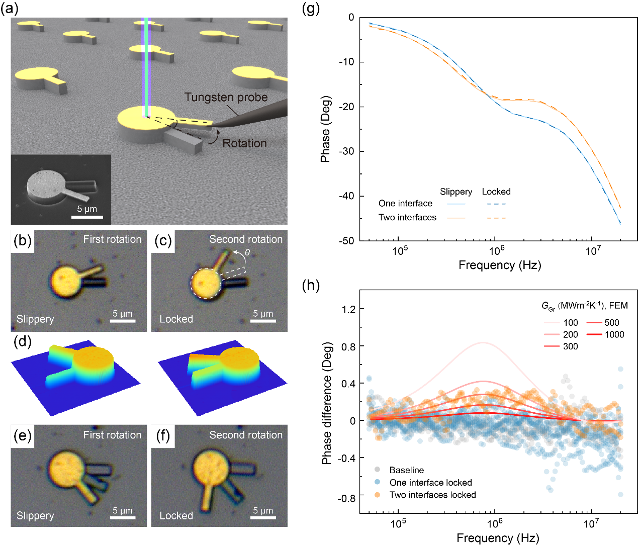 在此基础上,直接在HOPG上加工带旋转柄的石墨岛,并利用自行搭建的精密力学操作平台推动其中的特定界面旋转,对比旋转前后的热测量信号差异(图3)。这一过程不仅确保了石墨界面的质量不会因转角发生变化,同时也保证了旋转前后仅有转角这个单一参数发生变化。