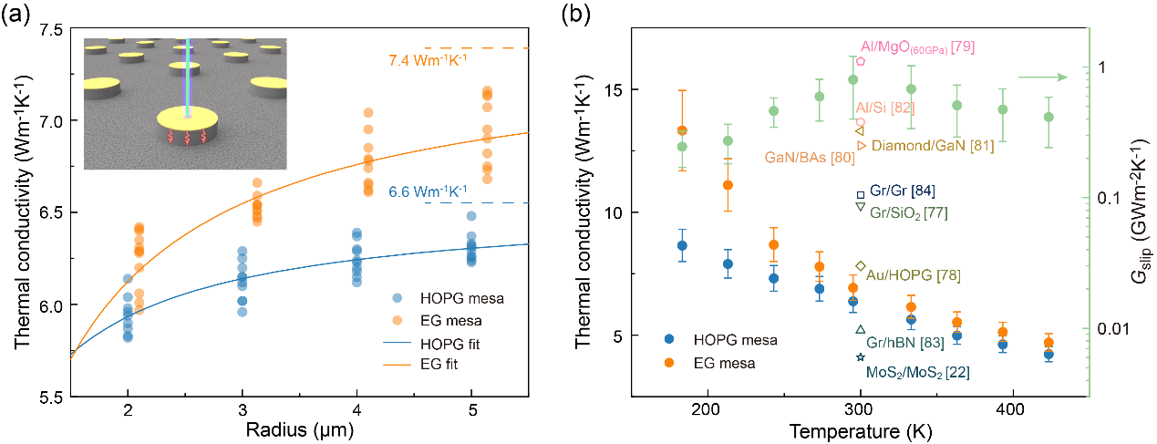 然而,这种奇特的结构超滑界面的热输运特性却始终笼罩在迷雾之中。尽管人们对石墨优异的热学性质早有研究并加以利用,但其中新奇的热输运现象,比如声子水力输运和第二声,至今仍存在许多未解之谜。而或许更令人意外的是,石墨的本征热导率,事实上也仍无定论。这侧面反映了对于石墨这种层状材料的导热研究的挑战。而对于石墨内“深埋”的超滑界面,其热测量则更加困难。因此,尽管有一些理论计算工作讨论了层间转角对于界面导热特性的影响,可靠的实验测量仍鲜有报道。而这对于深化声子输运的机理认识,以及基于石墨的器件热管理和芯片散热都十分重要。