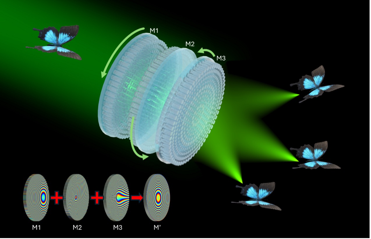 基于此,研究团队创新性地提出了一种基于莫尔理论的三维可变焦超构元件。该元件由三个级联的超表面组成,通过精心设计的相位轮廓实现了焦点位置的动态调控。实验结果表明,该超构元件可在3.7至33.2毫米范围内连续调节焦距,同时实现横向焦点的灵活调整,动态眼动范围达到4.2至5.8毫米。