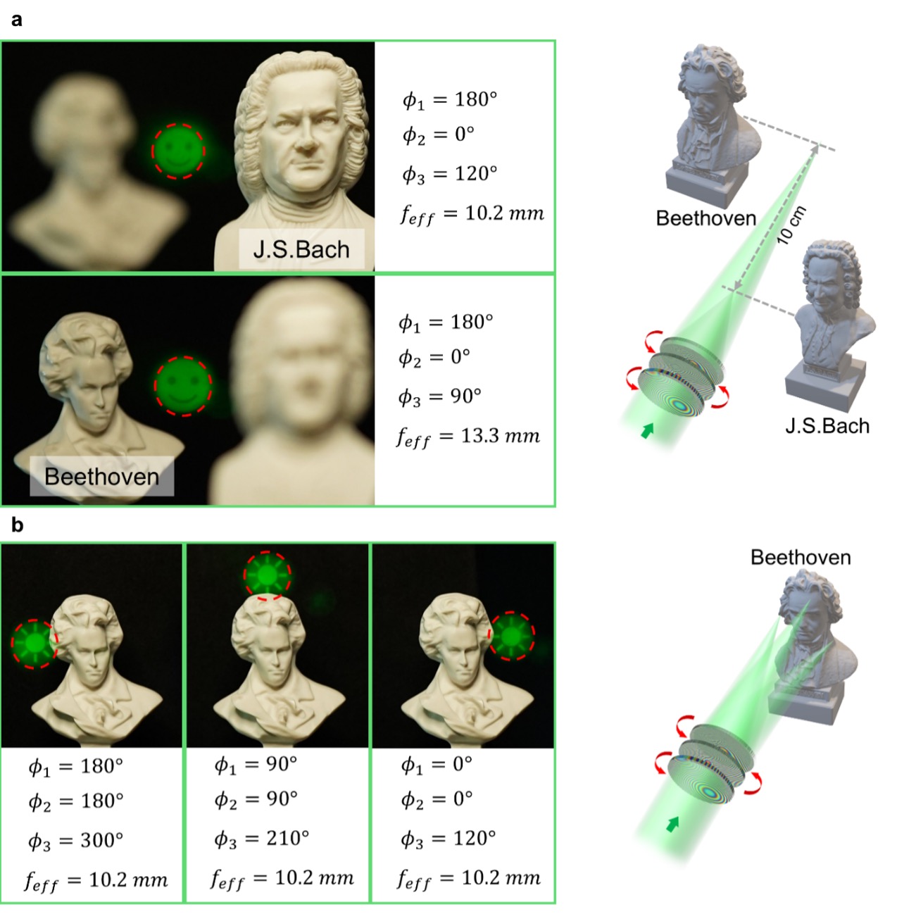 图1.三维可变焦超构元件操控焦点位置和显示的示意图