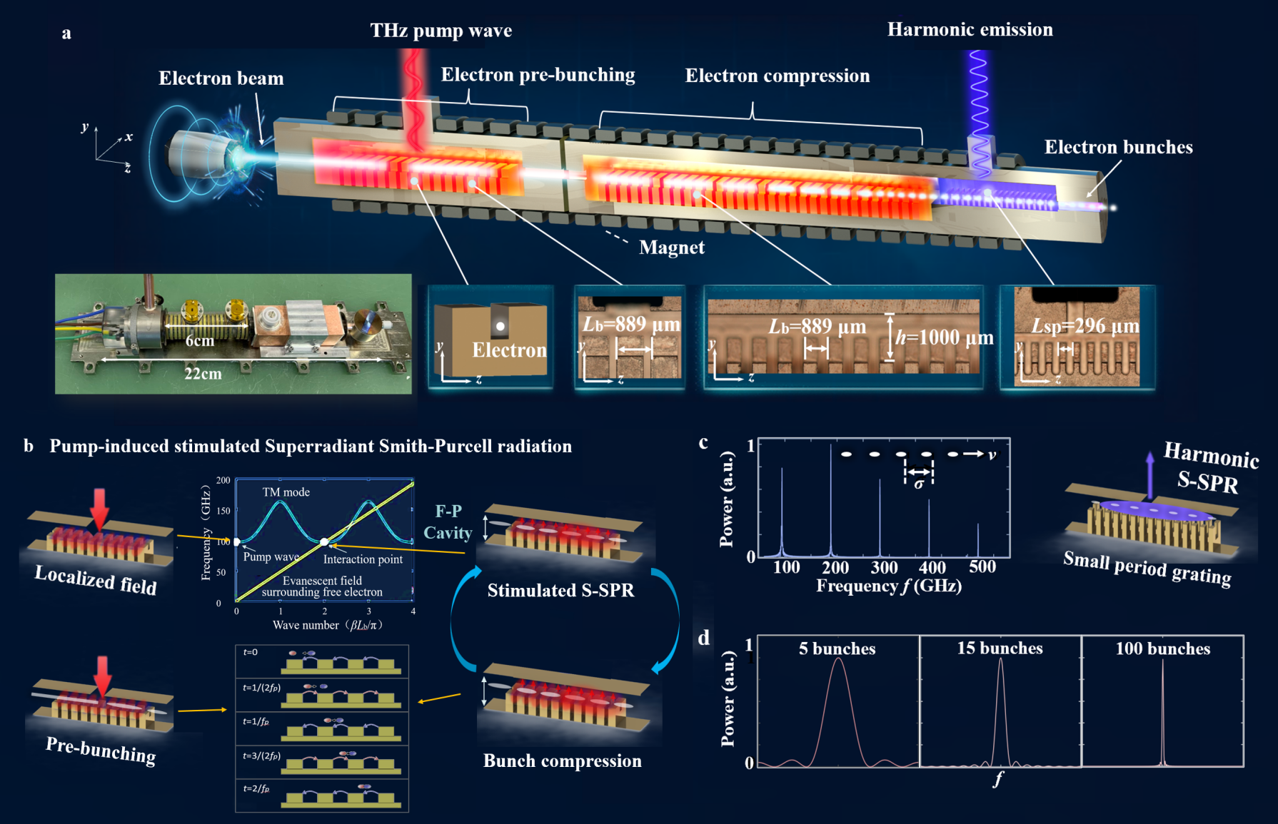 首页网4月23日电 4月17日,心博在线登录入口电子系黄翊东教授团队刘仿课题组与中国电子科技集团第十二研究所合作,提出并实现了泵浦诱导的受激史密斯-帕塞尔超辐射(Pump-induced Superradiant Smith-Purcellradiation, PIS-SPR),成功将自由电子辐射线宽压窄至0.3千赫兹,并实现了一种小型化自由电子太赫兹辐射源。该工作为实现自由电子辐射线宽的大幅压缩及小型化器件中史密斯-帕塞尔的高次谐波产生提供了新途径,并为研究自由电子束团与微纳结构的相互作用搭建了重要平台。