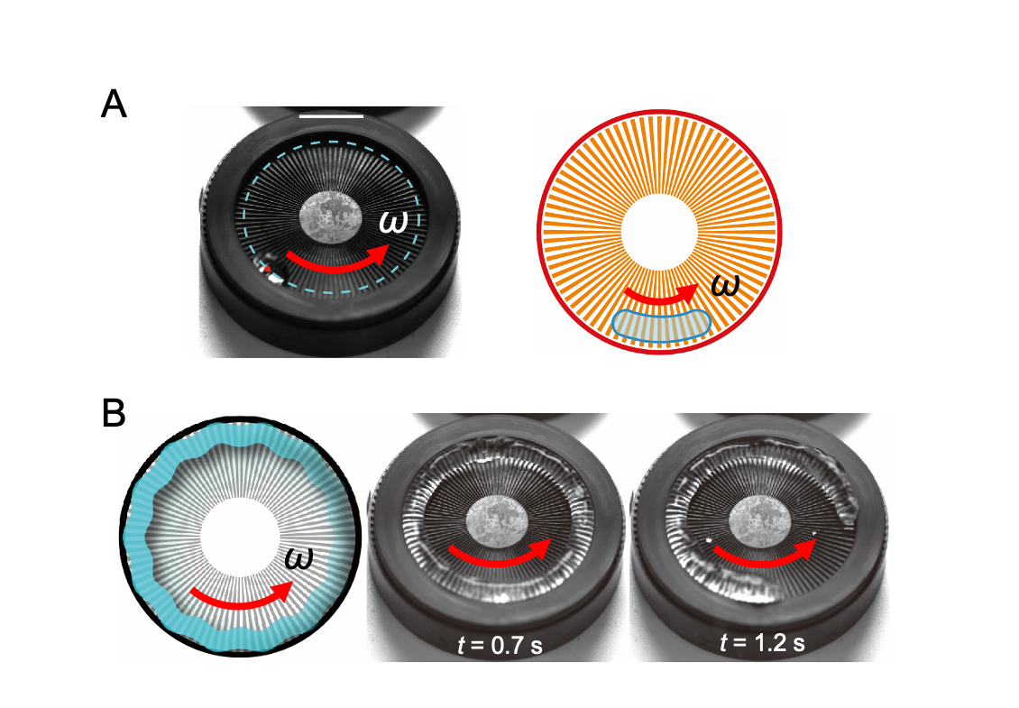 图3. 沿圆周方向对称排列的脊结构表面上的液体自驱动。(A)液滴运动;(B)液环旋转
