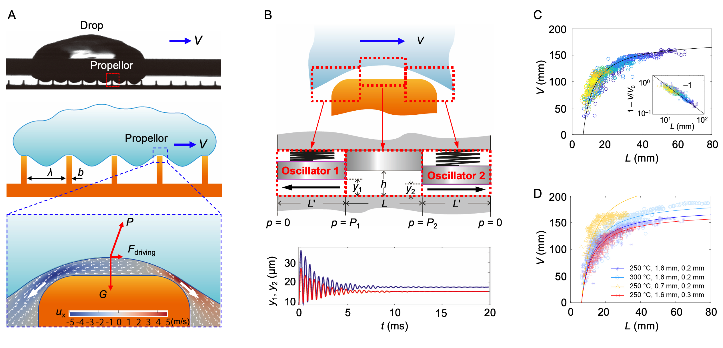 图2. 液体自驱动的动力学过程。(A)实验及计算流体动力学模拟结果;(B)气-液界面振荡理论模型;(C, D)液滴输运速度与其长度、基底温度及几何结构尺寸的关系