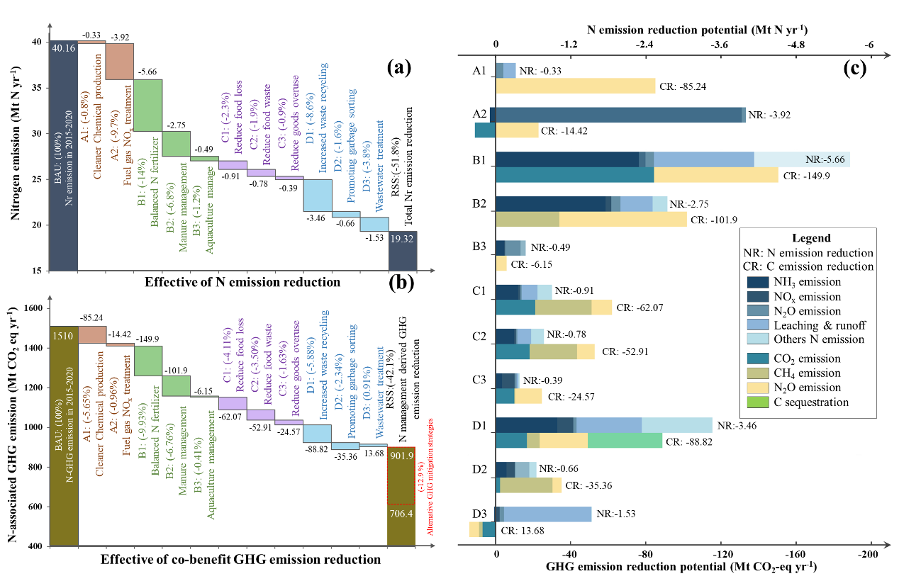 图2. 碳-氮耦合管理对中国氮减排和温室气体减排的协同效应