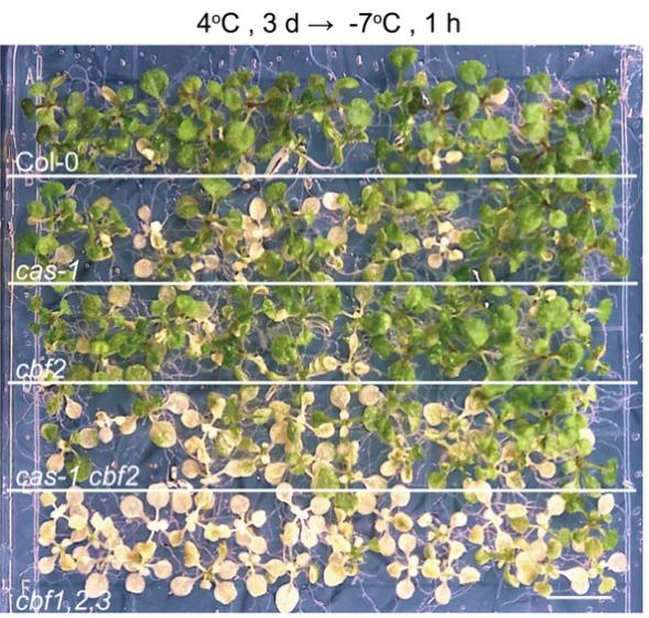 戚益军课题组之前在全基因组范围内鉴定了模式植物拟南芥中的长非编码RNA,其中包括大量源自蛋白编码基因反义链的RNA,并发现反义RNA的表达通常和与其相对应的正义链基因的表达呈正相关,暗示反义RNA可能促进正义链基因的表达。在最近发表的研究中,课题组对冷诱导的反义RNA CAS的作用机制和生物学功能进行了深入研究,发现植物受低温(4°C)胁迫三小时后,CAS的表达大幅上调。为了探究CAS在CBF基因表达调控中的作用,课题组创制了多个cas突变体。在这些突变体中,CBF2表达未受影响,但CBF1和CBF3的表达均显著降低,表明CAS正向调控CBF1和CBF3的表达。由于CBF1、CBF2和CBF3功能冗余,为了评估CAS对植物抗冻能力的影响,课题组构建了cas cbf2双突变体。与cbf1 cbf2 cbf3三突变体类似,在cas cbf2中,COR基因激活显著受损,植物对冷冻的耐受性下降(图2)。这些结果表明,CAS通过正向调控CBF1和CBF3的表达,增强植物抗冻能力。