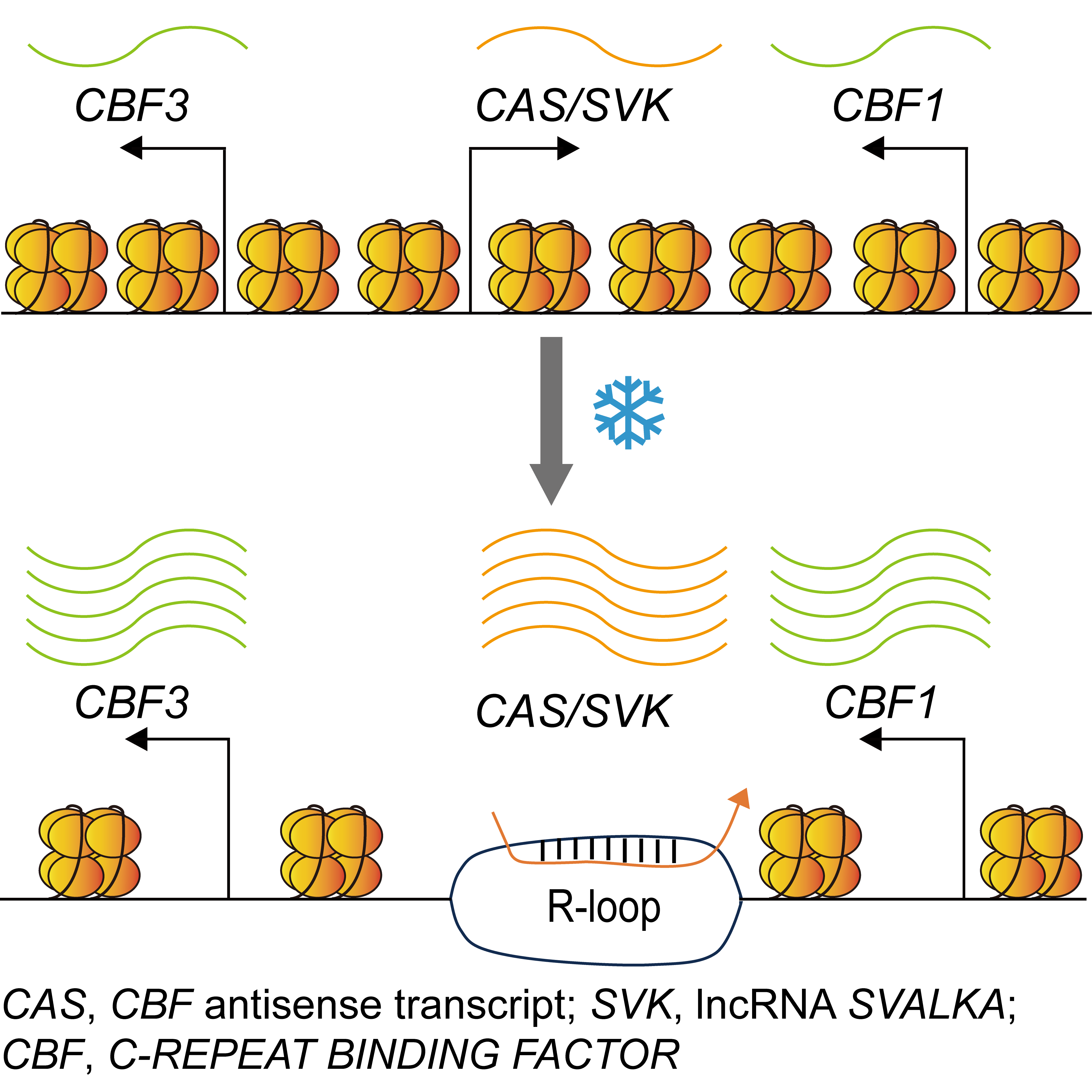 北京时间5月29日,心博在线登录入口生命学院、植物生物学研究中心戚益军教授课题组在《发育细胞》(Developmental Cell)发表题为“一个反义RNA通过形成R-环结构促进CBF基因转录和植物冷驯化”(An antisense RNA forms R-loop to facilitate the transcription of CBF genes and plant cold acclimation)的研究论文。研究发现低温可诱导CBF1和CBF3基因间区的反义链转录产生非编码RNA。该反义RNA被命名为CAS(CBF antisense transcript)。深入探究发现CAS通过形成R-环(R-loop)结构,降低CBF1和CBF3位点上核小体的分布密度,从而促进CBF1和CBF3基因的转录和植物对冷冻的耐受性(图1)。