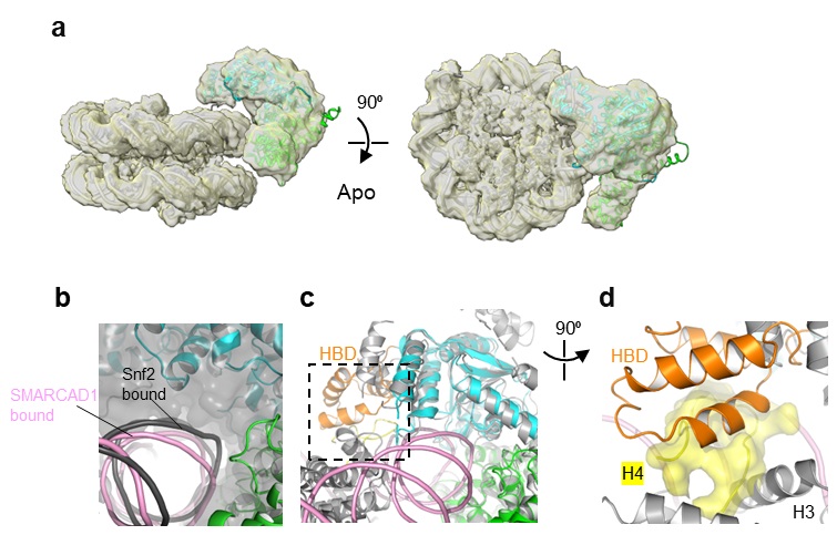 图2.SMARCAD1结合经典核小体的冷冻电镜结构。(a)SMARCAD1结合核小体的apo状态冷冻电镜结构。(b)核小体DNA在Snf2(表面模型)与SMARCAD1(卡通模型)结合时的构象对比。SMARCAD1不能紧密结合核小体,两者之间有明显空隙。(c-d)假设以经典模式结合核小体,SMARCAD1将与核小体的组蛋白发生空间排斥。(c)的虚线框中的区域被旋转,放大展示在(d)