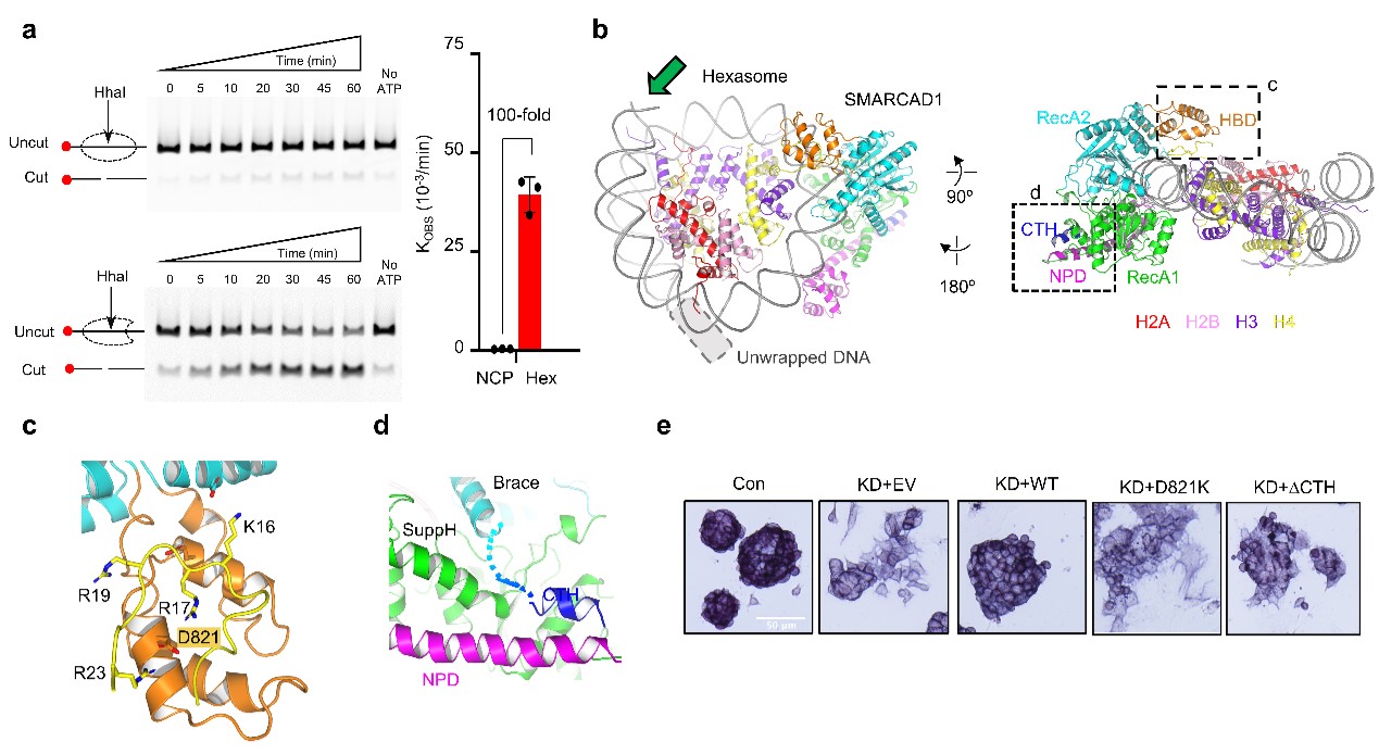 SMARCAD1是一种非经典的染色质重塑蛋白,对DNA损伤修复以及胚胎干细胞的异染色质维持起重要作用。研究人员通过多种染色质重塑活性检测方法,意外发现SMARCAD1对亚核小体有显著的活性,而对经典核小体的活性微弱(图1a)。为揭示这一独特偏好性的机制,研究人员通过冷冻电镜单颗粒技术解析了SMARCAD1结合六聚核小体的复合物结构(图1b)。与经典的结合方式不同,SMARCAD1马达结构域转向六聚核小体中因DNA解缠绕留下的开放区域。电镜结构揭示了SMARCAD1内部的几个关键构造特征。其中,马达内部插入有一个独特的组蛋白结合结构域(HBD,图1c),HBD与H4的相互作用对SMARCAD1的染色质重塑活性至关重要;SMARCAD1的C-端螺旋(CTH,图1d)向外延伸并顺势结合到NPD上,从而把两个核心的马达结构域连接起来,这对偶联ATP水解和DNA滑移必不可少。在小鼠胚胎干细胞中,研究人员通过敲低、回补Smarcad1基因证实HBD、CTH等关键元素对Smarcad1发挥干细胞多能性维持作用不可或缺(图1e)。