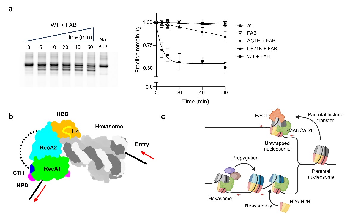 图3.SMARCAD1-FACT相互作用及功能协同。(a)SMARCAD1与FACT协同重塑核小体。右图是核小体滑移的动力学跟踪分析。WT:野生型SMARCAD1全长蛋白;D821K:具有D821K突变的SMARCAD1;ΔCTH:将CTH截短的SMARCAD1蛋白;FAB:FACT与H2A-H2B 二聚体混合物。(b)SMARCAD1滑移hexasome的卡通模式图。(c)SMARCAD1在复制叉区域发挥功能的可能模式:帮助亲代组蛋白转移到子代;推动复制后抑制性组蛋白修饰扩散,以及滑离过于靠近的亚核小体与核小体,帮助重新组装染色质