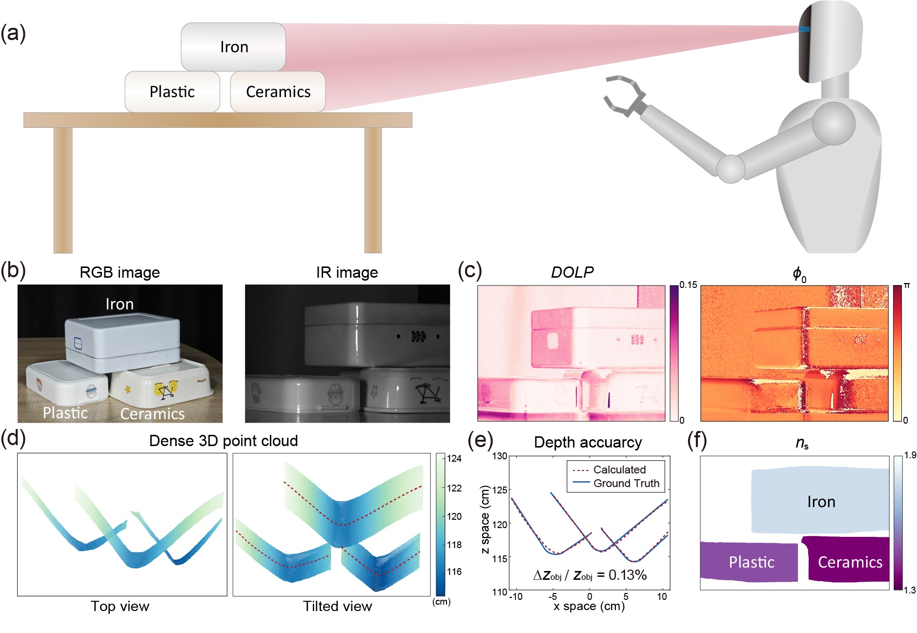 除获取高质量三维点云之外,EM3D系统还具备超出传统二维或偏振成像系统的物体辨识能力。如图3所示,当机器人需要从桌上的三个不同材料的物体中抓取其中一个时,使用传统的彩色成像、近红外成像或偏振成像均难以分辨三个物体;而ED3D系统不仅可以提供准确的三维点云以帮助空间定位,还能通过偏振与三维信息结合获得的材料参数清晰辨识不同材料的物体。这一集成于单目相机中的多模态成像功能有望显著拓展空间受限机器视觉系统的能力。