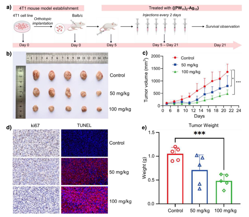 图2.{(PW11)2-Ag13}在4T1小鼠肿瘤模型中的抗肿瘤效果