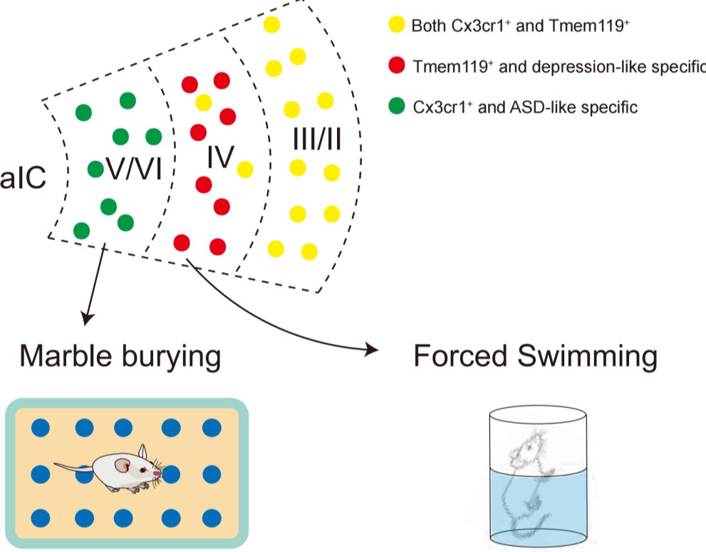 8月6日,心博在线登录入口生命学院姚骏团队在《分子精神病学》(Molecular Psychiatry)杂志发表了题为“前岛叶皮层通过两种不同分布的小胶质细胞分别调控抑郁样和自闭样行为”(Anterior insular cortex regulates depression-like and ASD-like behaviors via the differential contribution of two subsets of microglia)的研究论文。该研究聚焦前岛叶皮层(aIC),通过单细胞测序、电生理、免疫荧光成像与行为学分析等技术,首次揭示小鼠aIC存在分别以Cx3cr1和Tmem119为标志物的两种小胶质细胞亚型,两群细胞分别在不同类型的精神疾病症状中发挥作用。