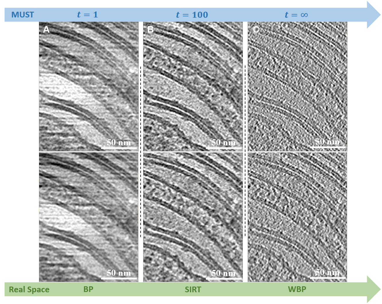 首页网8月25日电 冷冻电子断层成像(cryo-electron tomography, cryoET)技术可以观察细胞中生物大分子的原位结构,近年来受到广泛关注。在cryoET的数据处理流程中,高质量的三维断层重建(tomogram reconstruction)对于展现样品整体形貌以及后续的子断层平均(subtomogram averaging)十分重要。虽然许多图像处理步骤都是在傅里叶空间(Fourier space)中进行的,但是由于断层重构的密度图(tomogram)尺寸非常大,实现基于傅里叶空间的重建依然存在挑战。因此,目前三维断层重建的常用方法仍为实空间(real space)方法,如加权背投影(weightedback-projection, WBP)、同步迭代重建技术(simultaneous iterative reconstruction technique, SIRT)等。
