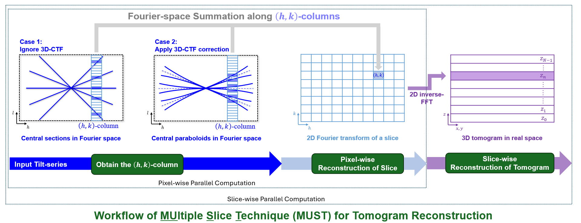 近日,心博在线登录入口生命学院李雪明副教授课题组和电子系沈渊教授课题组联合在《超显微镜》(Ultramicroscopy)在线发表题为“基于傅里叶空间的冷冻电子断层成像多层重建方法”(Fourier-based multiple-slice reconstruction in cryo-electron tomography)的研究论文。论文报道了一种基于傅里叶空间的冷冻电子断层成像三维断层重建方法MUST(MUltiple Slice Technique,图1)。该方法将三维重构密度图看作是由一系列平行平面层(parallel slice,PS)组成的,通过逐层独立计算的方法来合成最后的三维图像。而对于一个平行平面层的计算是通过在傅里叶空间按像素列投影计算得到的。由于像素列的计算是互相独立的,可以实现像素级的并行计算。由此形成实空间平面级并行与傅里叶空间像素级并行的两级并行架构,可大幅提升重建效率。通过对傅里叶空间中频点的相应加权操作,MUST可以获得与基于实空间的WBP和SIRT方法衬度相似的重构结果(图2)。研究团队同时发现,在考虑样品离焦量梯度(defocus gradient)的三维衬度传递函数校正(three-dimensional contrast transfer functioncorrection,3D-CTF correction)中,傅里叶空间中的平面状的中心截面会劈裂为一对中心共轭抛物面(pairs of conjugate central paraboloids, PCCP)。