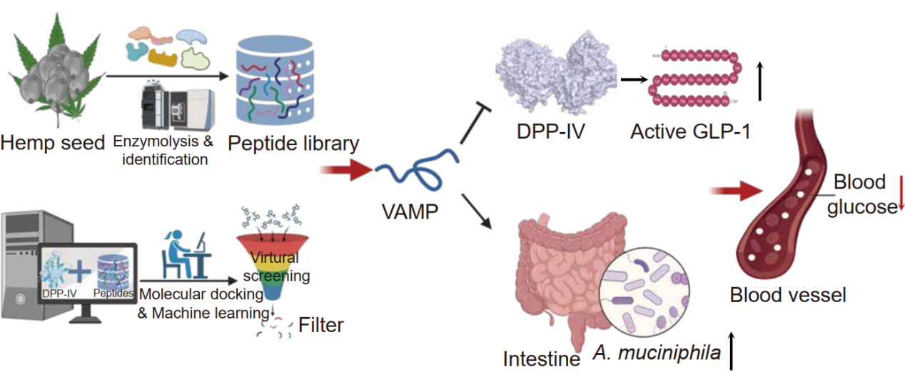 综上,研究建立的整合筛选方法为生物活性肽挖掘提供了新范式。新发现的火麻仁来源四肽VAMP通过抑制DPP-IV活性和特异性促进阿克曼氏菌增殖的双重机制改善糖代谢,为开发基于天然活性肽的降糖干预策略提供了理论依据和可靠方法。