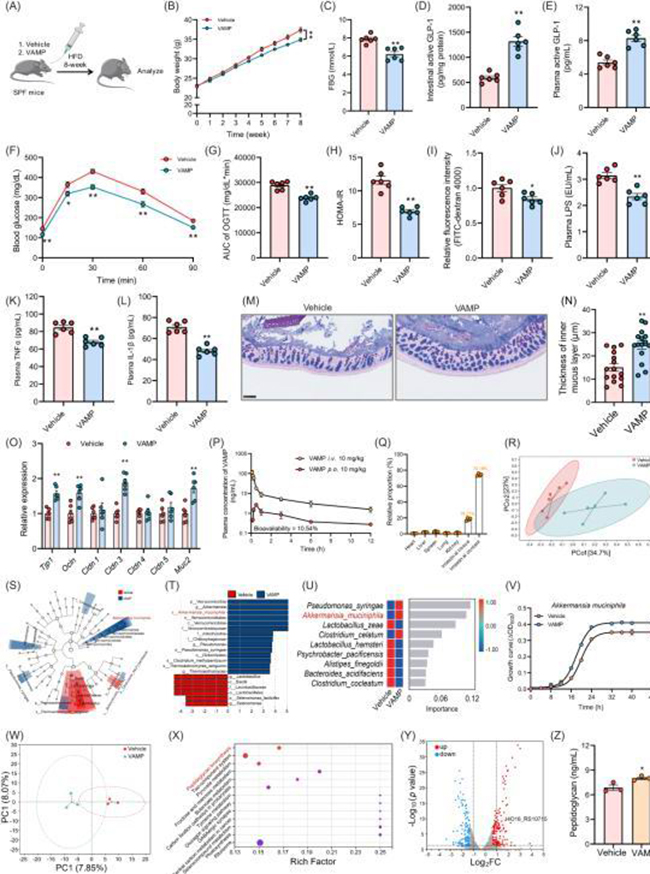 研究团队评估了VAMP在糖代谢异常小鼠中的作用效果发现,VAMP干预显著提升了肠道和循环中活性GLP-1水平,并有效改善了糖代谢和胰岛素抵抗(图3A-H)。同时,研究团队发现VAMP干预可显著增强肠道屏障完整性,并缓解代谢性内毒素血症(图3I-O),进一步通过药代动力学分析显示VAMP口服生物利用度为10.54%,在其血药浓度达到峰值时仍有74.18%的VAMP存在于肠道内容物中(图3P-Q),这表明除了抑制肠道DPP-IV活性外,VAMP可能通过直接作用于肠道菌群发挥调控作用。研究结合肠道菌群变化结果,发现VAMP通过抑制肠道DPP-IV活性和改善肠道屏障功能,改善糖代谢紊乱问题(图3R-U)。