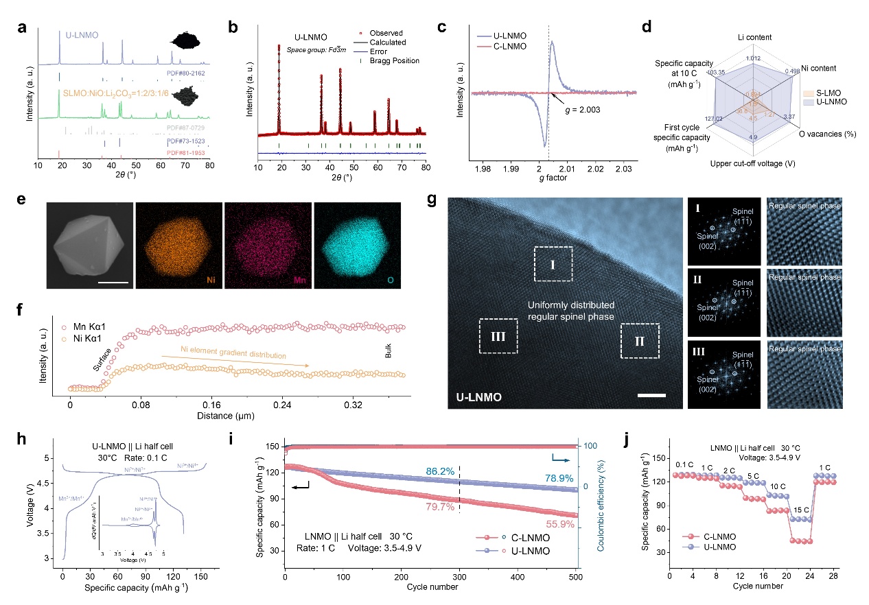 以失效锰酸锂(LiMn2O4)材料为例,研究构建了连续相转变的路径,展示了将其单步超快升级为下一代高性能锂离子电池正极材料的有效性与通用性。升级产物包括高压快充型镍锰酸锂(LiNi0.5Mn1.5O4)正极材料和高能量密度型无钴富锂锰基层状氧化物(Li1.2Ni0.2Mn0.6O2)正极材料等,从而将整体经济效益较直接修复提高3~5倍。更重要的是,得益于超快非平衡反应过程,有效调控了锂离子、过渡金属离子及空位缺陷的迁移与重排行为,成功在材料中引入元素梯度分布及适量的有益结构缺陷,再生产物的循环稳定性及快速充放性能超越了同类商业正极材料。