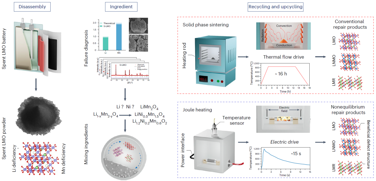 首页网8月29日电 锂离子电池被广泛应用于诸多领域,但其有限的使用寿命带来了资源紧张和环境风险等挑战,因此废旧锂离子电池的回收已然成为学术界和产业界关注的焦点。与从废旧电池中提取关键金属的传统冶金方法不同,直接回收工艺可以修复受损材料,并通过有效的处理最大限度地运用其价值。然而,现有直接回收方法依赖长时间加热以实现失效结构的重排。同时,锂离子电池的性能基准不断提升,即使废旧锂离子电池直接再生能够恢复其原始性能,往往也会与最新的市场要求存在差距,这两大问题对直接回收技术的发展与应用提出了全新挑战。