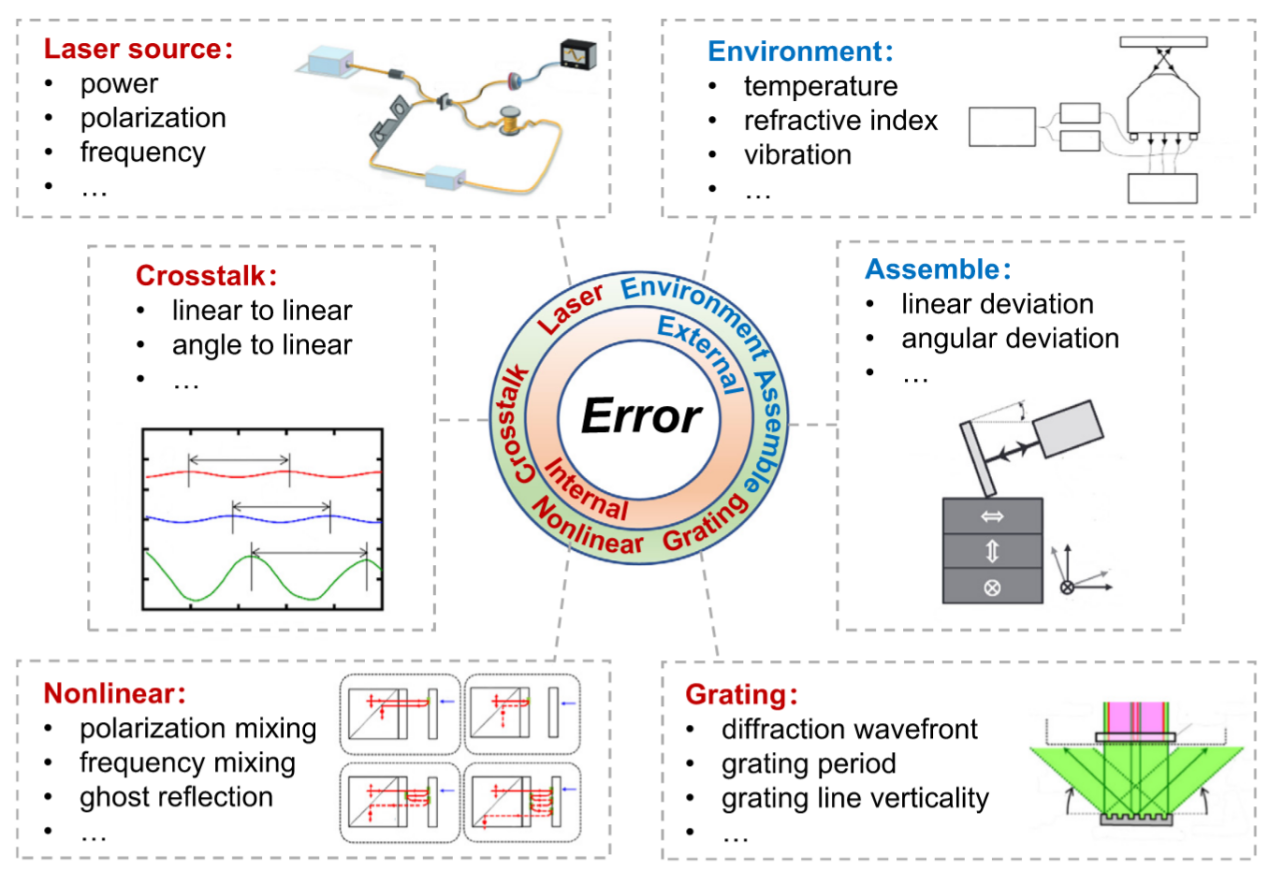 文章通过九张综合性表格,对不同测量维度的光栅干涉仪研究成果进行了系统梳理和横向对比,涵盖了位移、角度以及多自由度测量等方向。文章不仅在表格中汇总了典型系统的分辨率、测量范围和稳定性等关键指标,特别地,针对原子级精度,进一步通过误差量化分析表格揭示了主要误差来源及其补偿策略。文章以详实的数据呈现出光栅干涉仪在精密测量领域的发展脉络与技术差异,为后续研究与工程应用提供了权威而直观的参考。